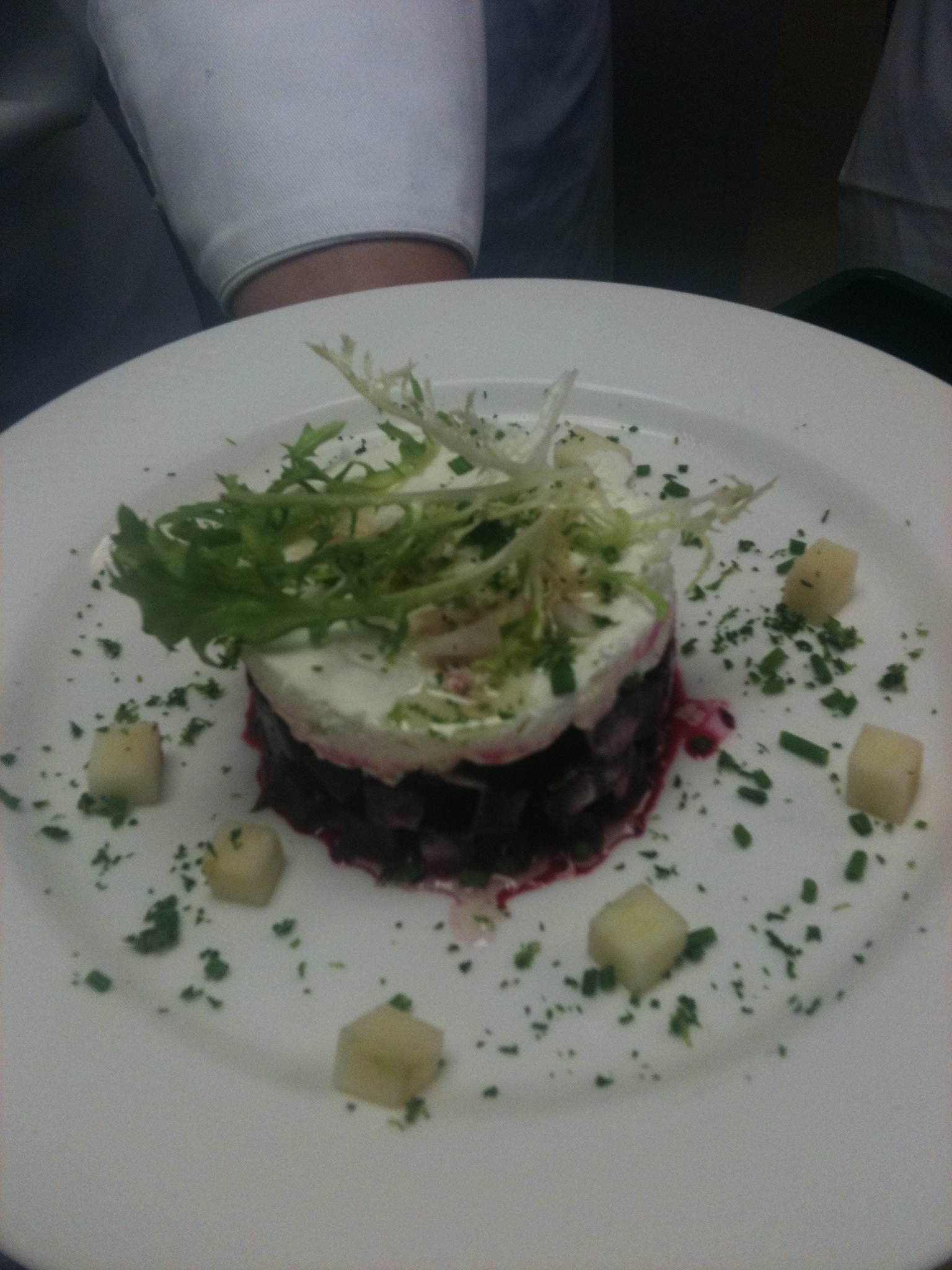 This is not my actual beet and goat cheese timbale dish because I forgot to take a picture of mine before I gave it to Chef Tomm to critique. But, all of ours looked like this, more or less. I cannot provide the exact details of the recipes, as I’m afraid that is copyright infringement (and once a lawyer, always a lawyer), but I’ll summarize the recipe for the pictured dish.
