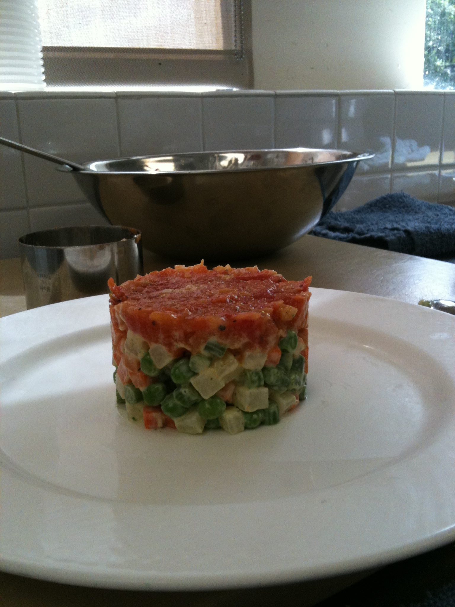 I usually eat a salad everyday, so I was excited by the salad unit today. Unfortunately, I was underwhelmed by this unit. The only salad I thought was interesting and tasty was the cooked vegetable salad with a fondue de tomate. The thought of “cooked vegetables” in my salad was, at first, somewhat unappealing (although blanching and shocking can make for some delicious vegetables in the right circumstances). But, the flavor combinations and presentation of this salad were definitely worth the time consuming steps. The Mark-Rachel “cooked vegetable salad” creation is below.