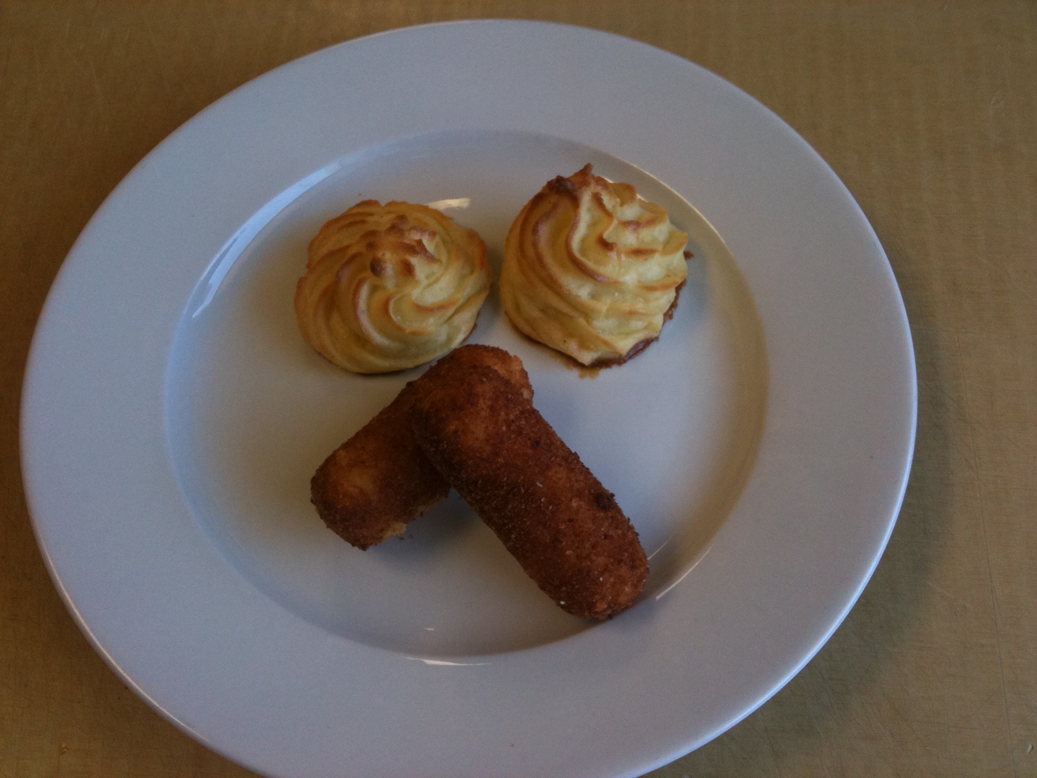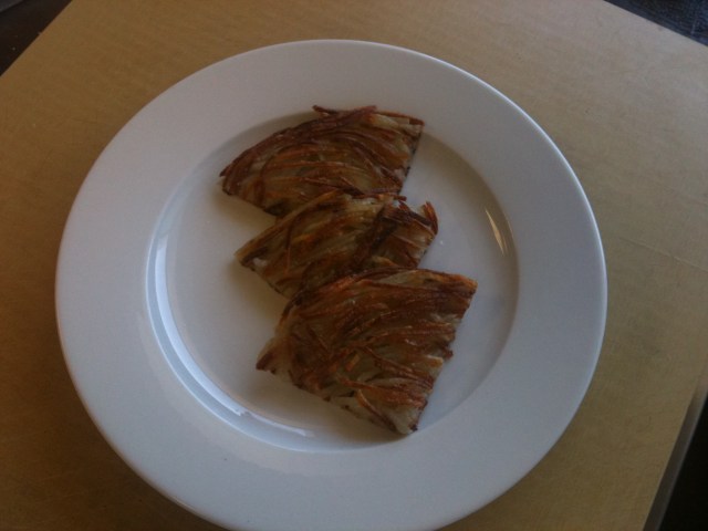 This is going to be a bit of a short post, as it’s 8:30 p.m., I haven’t eaten dinner yet and I haven’t studied for our second test tomorrow.  But, this weekend, I’ll post a recipe I liked from today, and I’ll be sure to post one from tomorrow’s fish unit, as well!   Today, you’ll have to get the picture of what we did from the pics. Thanks to my excellent partners, Ian and Anne, we busted out some pretty and pretty tasty potatoes (many, fried!). In order: 1) Croquettes and Pommes Duchesse on one plate (pictured above), 2) Pommes Anna, 3) Gratin Dauphinois (yes this was cheesy and delicious), 4) Pommes Darphin (rosti), and 5) a potato basket made from gaufrette slices (gaufrette is the waffle cut, I believe).  The gorgeous basket was Anne’s. The woman has talent, clearly.