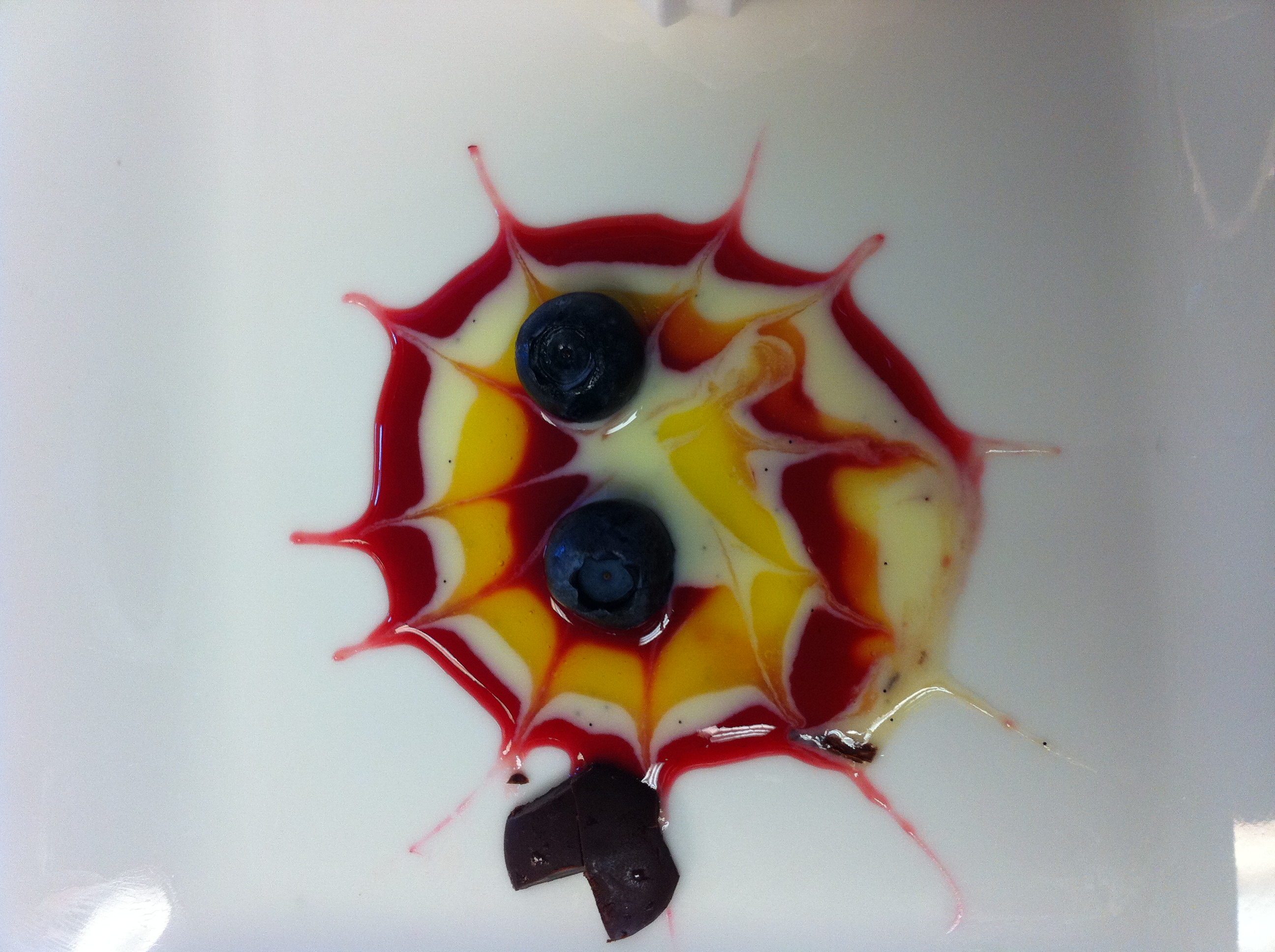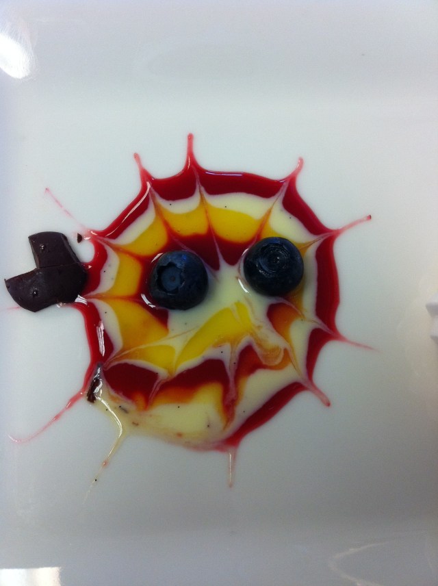 Today, it was all about the souffle. The featured picture at the top is David’s and my raspberry souffles. They tasted good, albeit a bit undercooked as I’m so freaked out about over baking anything, especially after looking at my little brown turd pate a chouxes (cream puff pastries). We made chocolate souffles (delicious!), cheese souffles, and fruit souffles. Today was also about playing with decorations on the plate. I loved Victor’s pufferfish he made using Chef Peter’s different sauces in squeeze bottles: