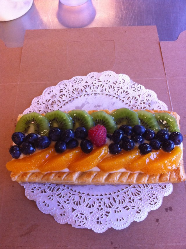 Although I’m all sweeted-out, I do love the puff pastry/creme anglaise/fruit tart we each made. Mark, we did it! After 3 tries, we made a puff pastry that worked. Puff pastry should not be that complicated, but apparently we made it so. At any rate, this is my finished tart:
