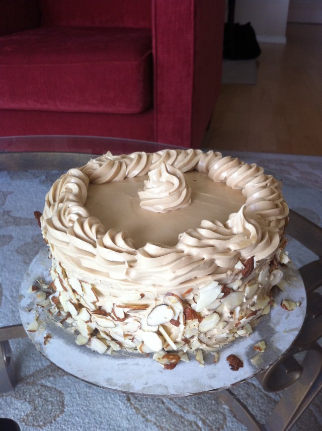 We cut the cake into 3 rounds, dipped each round into a coffee liqueur and simple syrup mixture, and then smeared each round with the coffee-buttercream mixture. There’s no sugar or butter in this cake at all 😉 The cake is going to the gym with me tonight. They will either curse my name or be happy to be eating something so decadent. Not sure which.
