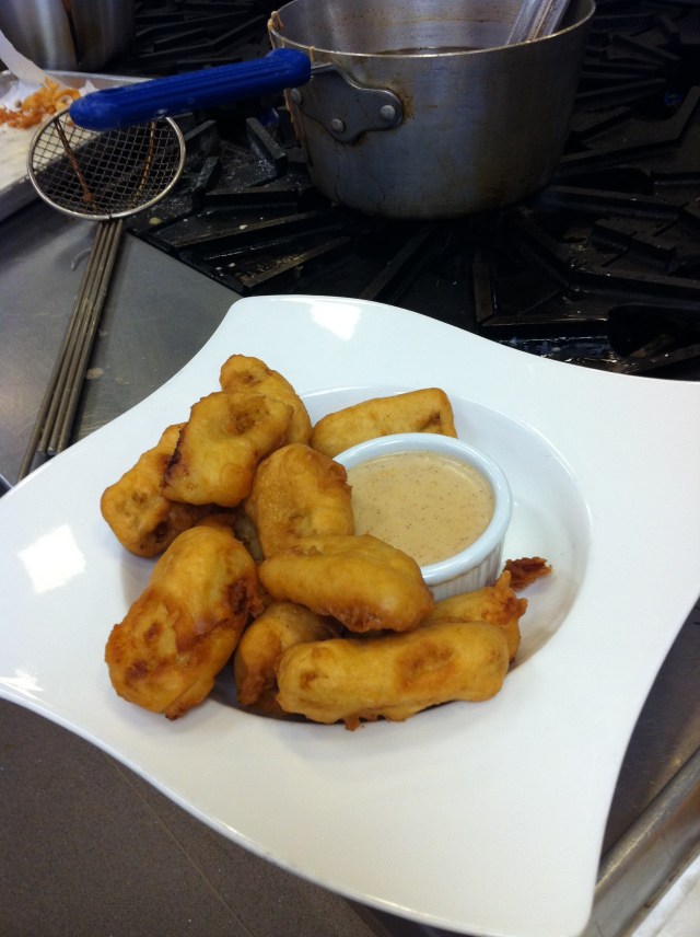 Class got a little slow after this. We made a cinnamon sauce for our banana fritters, which were banana slices dipped in a beer batter and double-deep fried. The point of the double deep fry was to crisp them up. This dish was very mediocre. The cinnamon dipping sauce was good only because Ian jazzed it up a bit from the original recipe. 5 of us agreed on that, so I was not alone in my assessment. Here’s a snapshot of the class watching Chef Tomm doing his second round of deep frying: