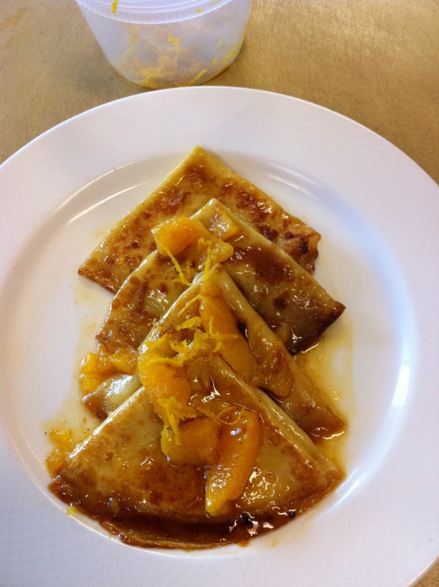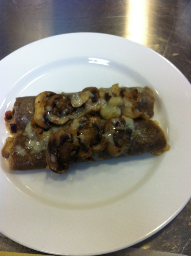 We made crepes suzette, with oranges, orange zest, orange liquere and way too much butter, of course (picture at top). Then, we made buckwheat crepes filled with smoked ham, onions, mushrooms, and gruyere, below: