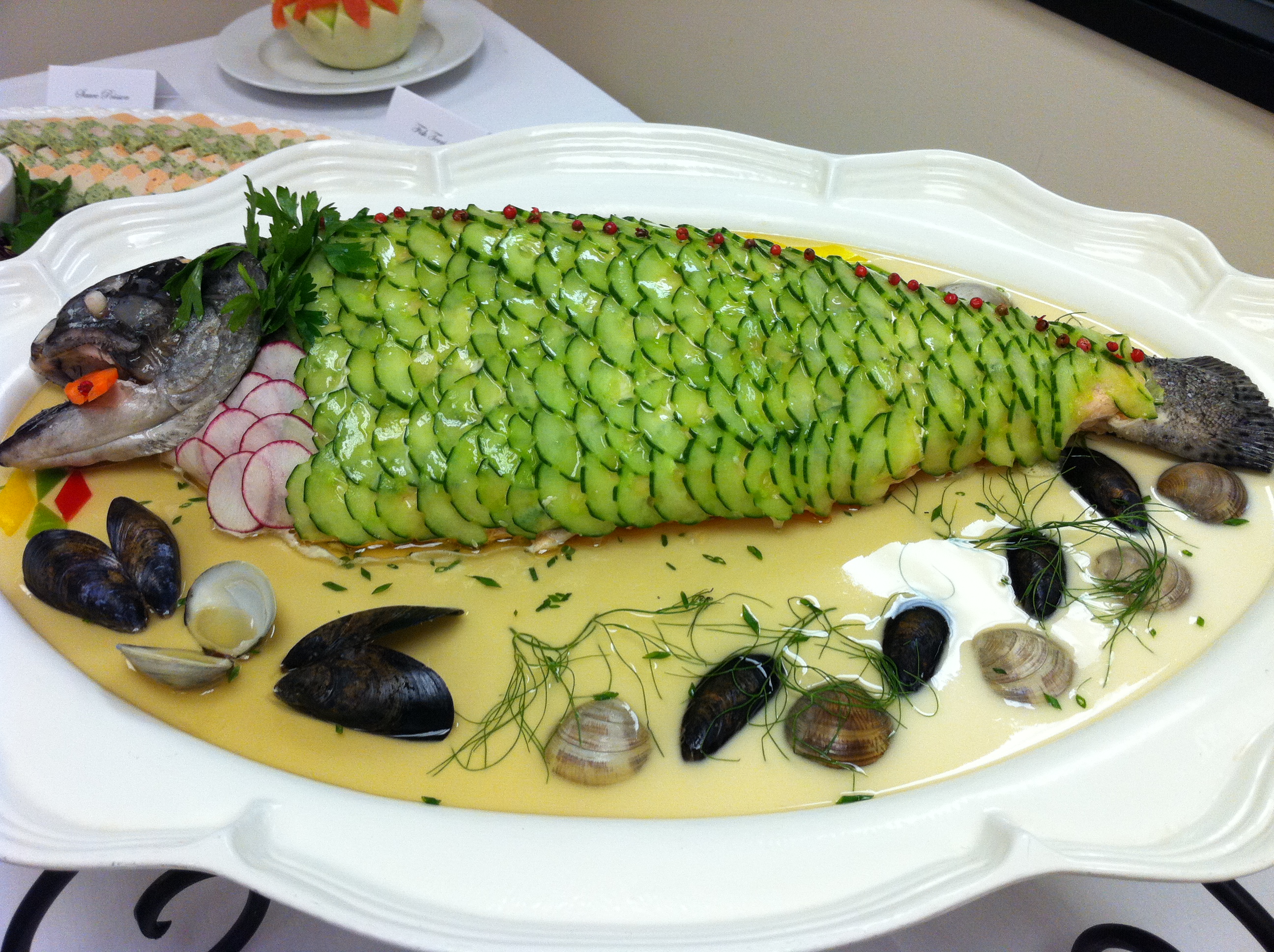 Today was end of Level II day, so that meant 3 tests: 1) written comprehensive test, 2) ServSafe test, and 3) practical test. I am happy with the results of the written comprehensive and the practical component, other than my lame chantilly creme piping skills. Honestly, I am terrible at piping rosettes and eclairs. I’m going to buy a CostCo sized jar of mayo and spend some time learning from Rachelle, who promised to show my how to make them prettier. Finally, I felt comfortable on my chicken quartering skills. It wasn’t “perfect”, but it was very decent and I didn’t take forever to do it. The flat fish we filleted was frozen so, unfortunately I had a bit of trouble with it, at first. But, all in all, it was a successful day. And, the BEST part was lunch.