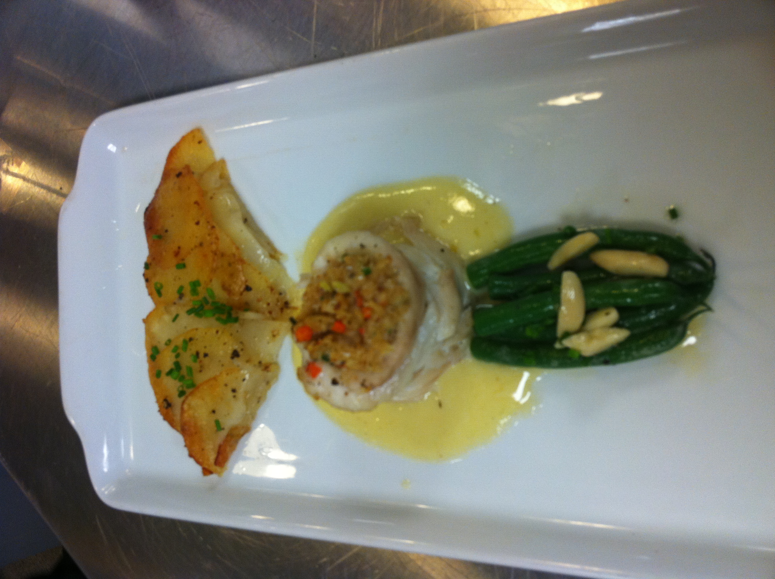 So, what has been going on at FCI for the past 3 days? Monday was “Flounder My Way” day. No, that gorgeous picture a top is not my fish – I wish. I decided I’d do a very “French” meal, so I made a good beurre blanc with mushrooms atop the poached flounder, all over my version of pommes anna, with sides of stuffed vegetables and a little vegie bundle: