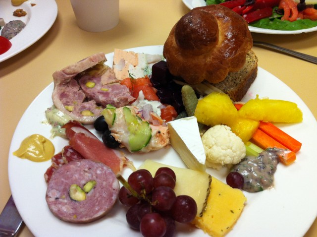 The lunch included different fish terrines, cured fishes, lovely sauces, fresh baked breads, all types of charcuterie, fresh fruits and vegetables, cheeses…. it was fabulous. Here was my piggy lunch plate: