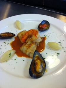 So, back to my week. Level III is all about timed tests every day. We have a mystery basket from which each of us has to make an amuse bouche, and then we make two other dishes (one is a joint dish with two other partners). Here’s a picture of one amuse last week – bass with curry and what I’m calling the Italian flag (I got overzealous trying to put a lot of color in it).