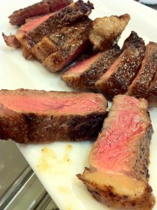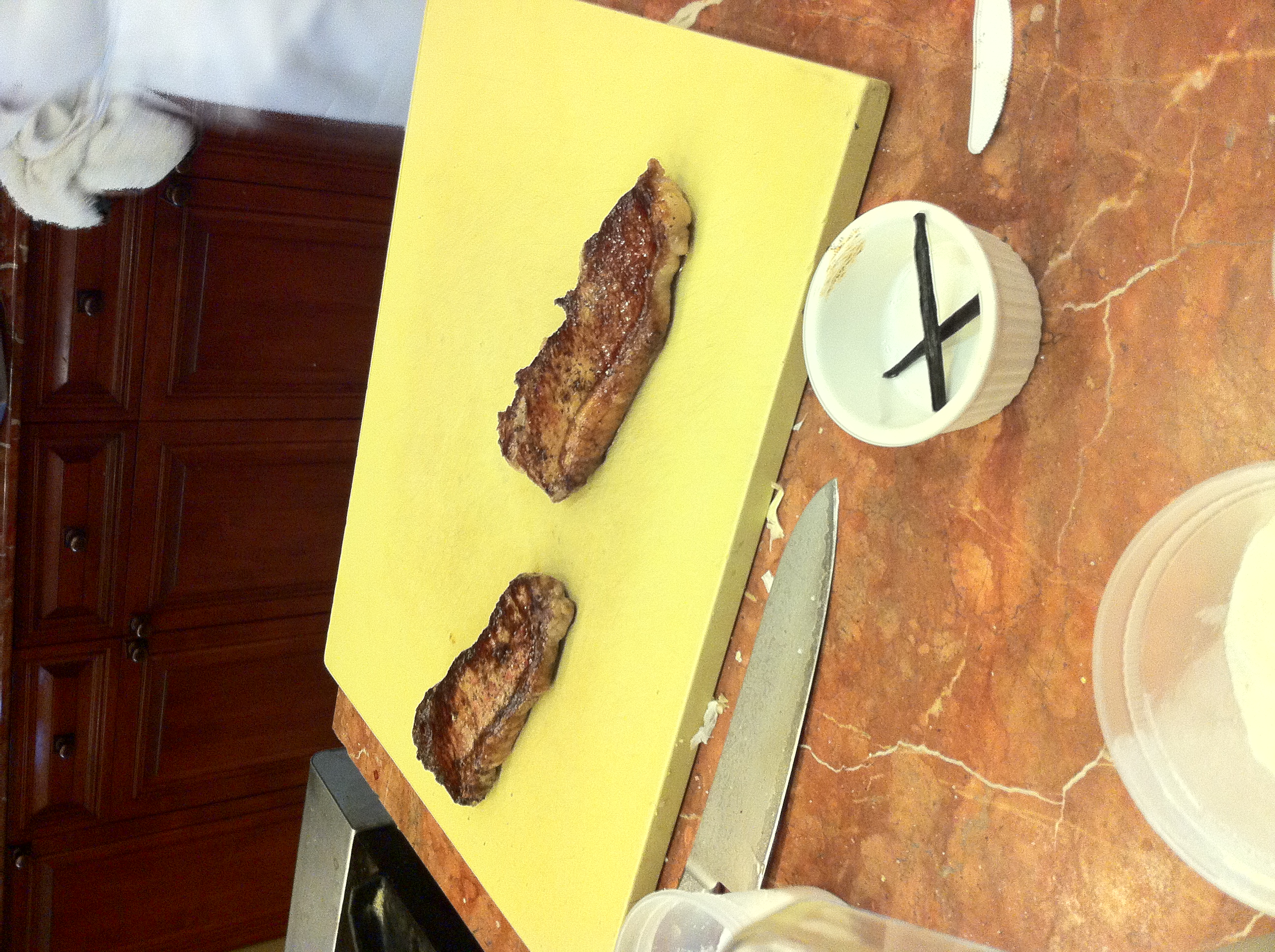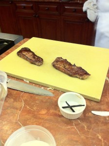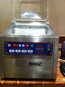 Yesterday was day 1 of Sous Vide, which means “under pressure” in French. Can you tell which steak was seared in a pan and put in the oven and which one was sous vide and then seared on the outside for a quick minute afterwards? Each of the steaks and pieces on the right in the above pictures was cooked sous vide; the ones on the left were seared in a pan on high heat and then put in the oven until medium rare. Anne and I enjoyed the sous vide steak more and Bobbie and Mark enjoyed the “cave man” style steak (seared on very high heat in a pan) more. The sous vide steak was softer in the middle and was more moist, we thought. The inside was a different texture, but I liked it. The sous vide prep was a raw steak (no seasoning) vacuum packed in the chamber sealer and then cooked sous vide at 125 degrees F for 26 minutes, then taken out and seared in a hot pan for about 1 minute on each side. Here’s the chamber sealer and one of the sous vide machines that our ribs went into: