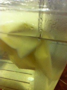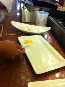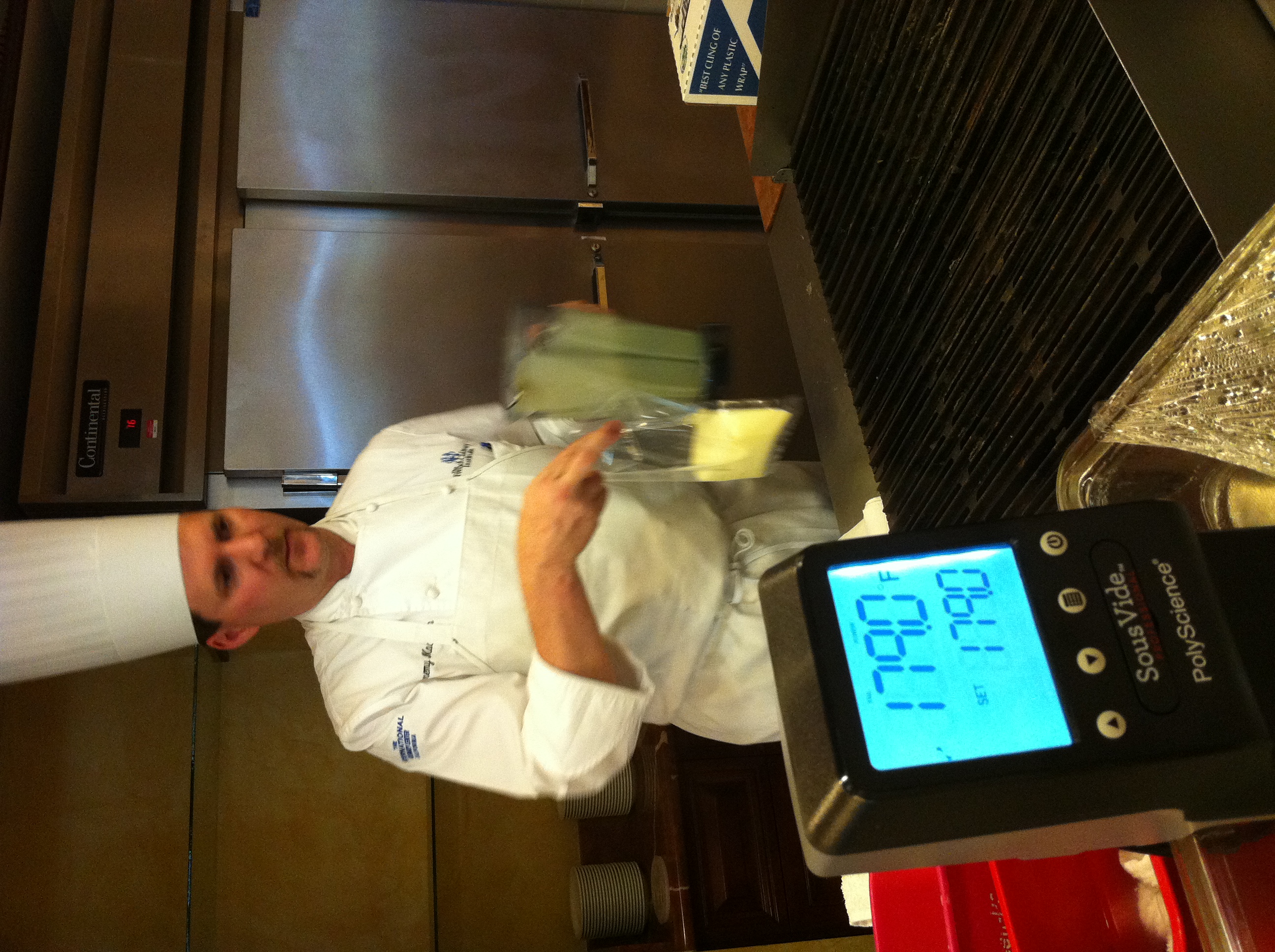 One other item Chef Jeremy showed us was how to chamber seal and sous vide creme anglais. Instead of cooking it over a bain marie and tempered, everything is put in a blender and then in a bag to vacuum seal. Then, it’s “cooked” at 179 degrees F until it was done (can’t remember how many minutes). I think the point of that was to show us how a liquid could be transformed sous vide and also to make sure we knew that you had to be very careful to not put too much liquid in the bags to be sealed, lest you wreck the chamber sealer machine if liquid gets sucked into the motor. Here are a few pics of the creme anglais demo: