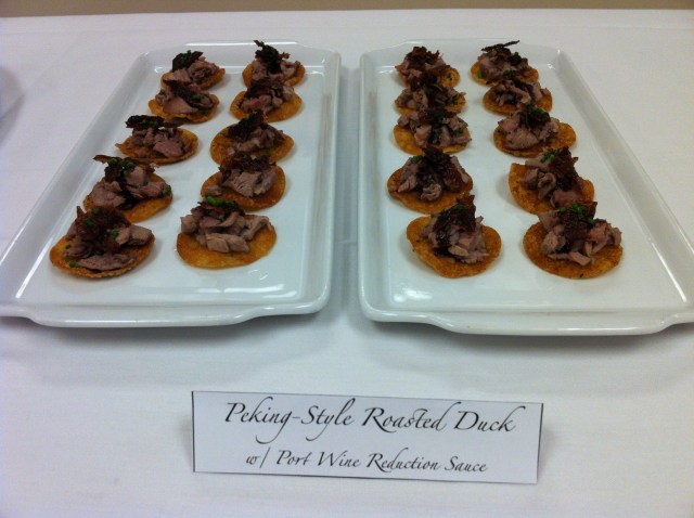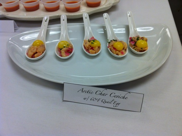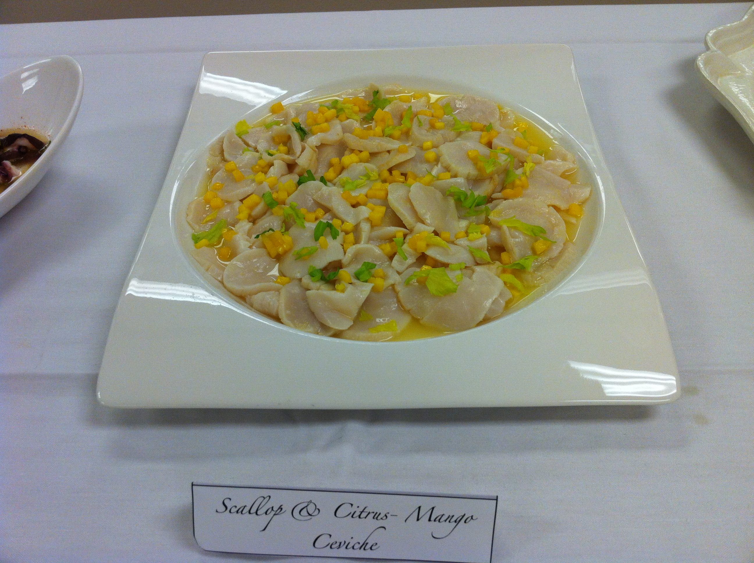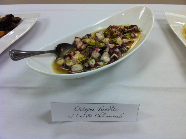 I learned a lot, especially by working with octopus. There is such a debate about the best way to cook/serve octopus if you don’t want it tough. I don’t think I necessarily succeeded in making it succulent, which was my goal, but many people gave compliments, I think mostly due to the marinade it was sitting in when served (orange, lemon and lime juice, sherry vinegar, sugar, salt and dash of Anne’s scallop marinade – thanks, Anne!). We tried woking it on very high heat for just a couple of seconds, but the octopus immediately seized up (we = Chef Ryan and I collaborating on it to try to make it the way I envisioned it).