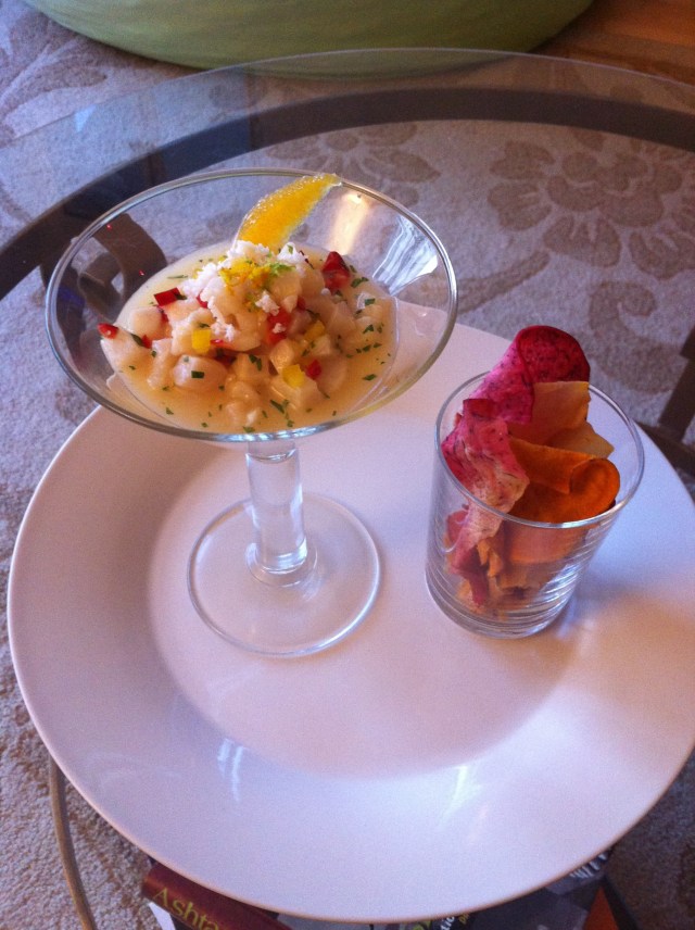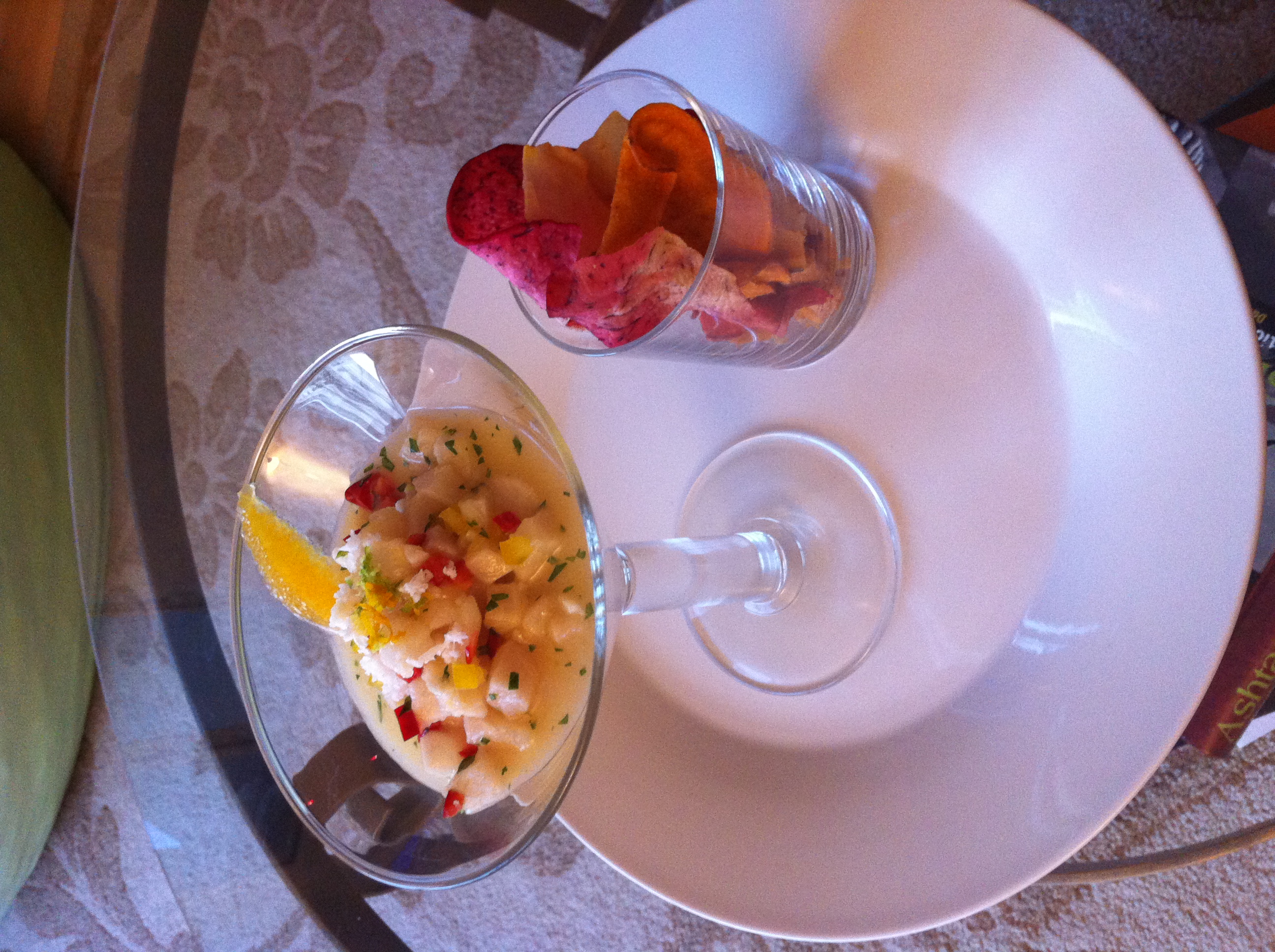 The assignment was to come up with a theme for a menu, to make at least 4 dishes each of which would feed 8 people, and to document the process, along with food costing and an essay. My menu consisted of 5 courses, all of which were fish, except that the amuse bouche had fish and pork in it (it was a dumpling). My theme was how I, Carnet and many of our friends like to eat, especially in Hawaii: fresh fish, lots of herbs, a little bit of an Asian flare with citrus elements. I haven’t posted many recipes lately, so I’m going to post 3 of my favorites from my menu project: 1) the prawn and pork dumpling in a lemongrass, shaoxing wine broth, 2) the 3 citrus ceviche, and 3) the crab, apple, avocado, radish and mint salad.