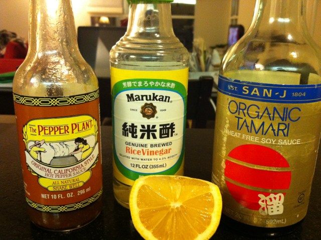 I used to season the pan with both garlic and onions in the first round, but the garlic tended to burn, so I’ve learned to throw it in later, although you run the risk of it staying a bit “raw” if you don’t get a lot of heat on it or for a very long time. After the beans and garlic, I added the purple cauliflower, and lastly I threw in the romanesco greens that I cut off the head of the romanesco the other day. That’s the “leaf to stem” part of Carnet’s cooking. 5 or so minutes into this layering, I went for the sauce. My sauce wasn’t really a sauce, but more of a light coating of flavors. Here’s what I used: a bit of kosher salt, 1/4 c. of wheat free tamari (soy sauce), a couple of tablespoons of rice wine vinegar, 1/2 of a lemon, and 3 tablespoons of my favorite hot sauce – The Pepper Plant original. Here are the brands I like (no, I don’t get any endorsement money for these):