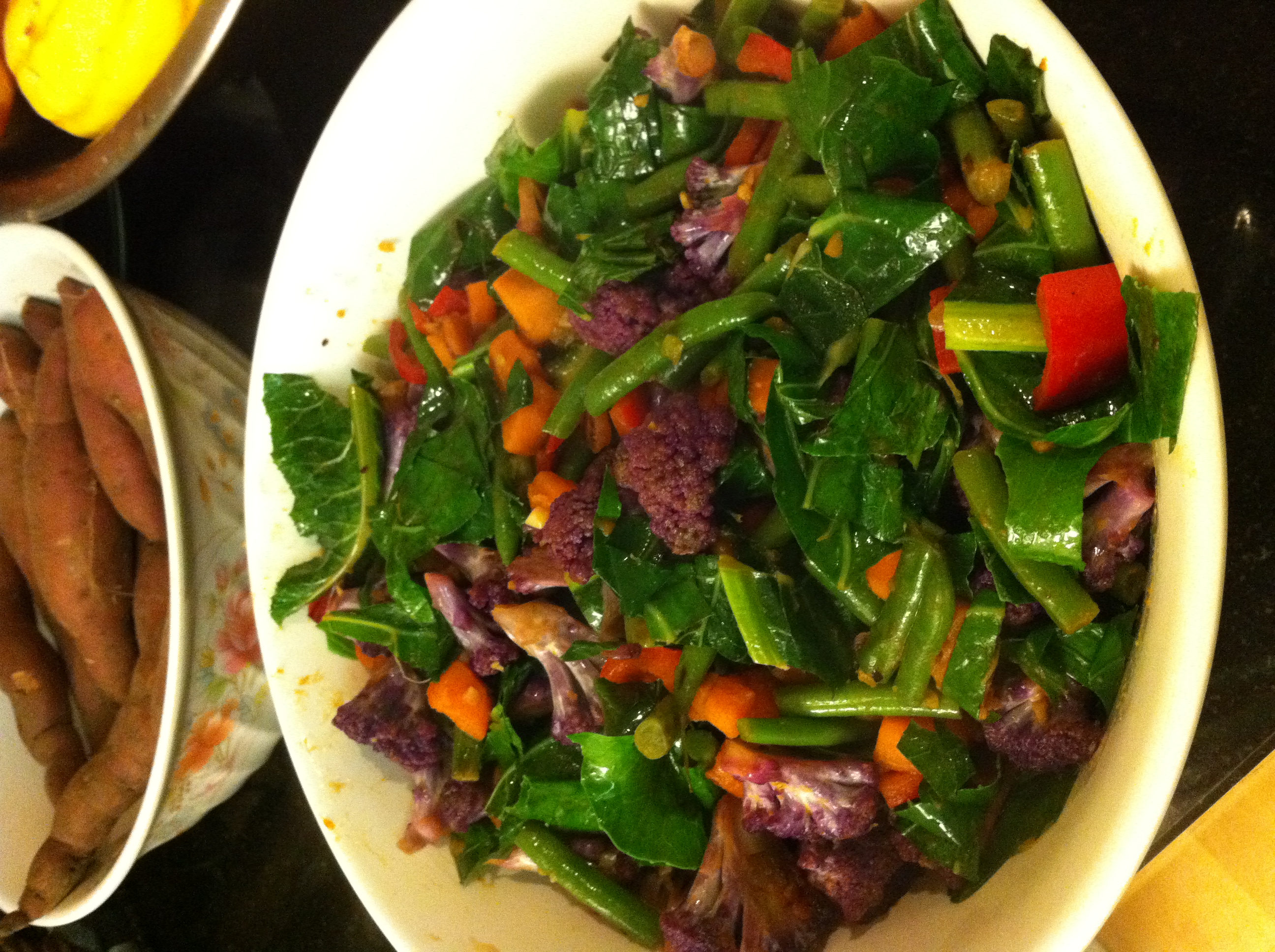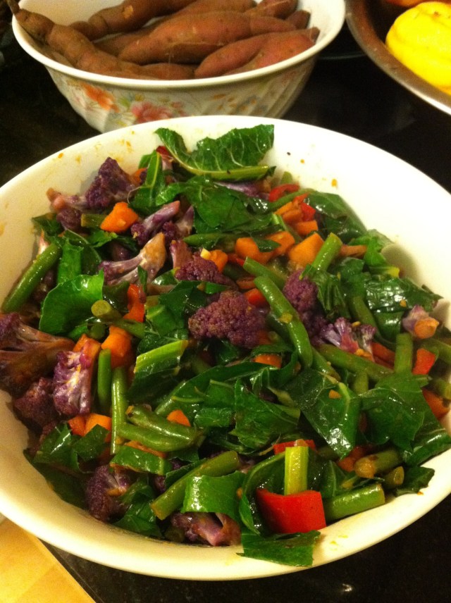 Speaking of using fresh, quality ingredients… I was wondering what I was going to make for dinner tonight. I had so many different vegetables from our CSA box last week that we needed to use up. So, I took a cue from my husband, the “leaf to stem, all in” kind of cook, and made a vegetable “stir-fry”, pictured at top. I think the purple cauliflower, along with the sweet potatoes (from the CSA box today, which means uber fresh), and the greens is a definite winning combo.