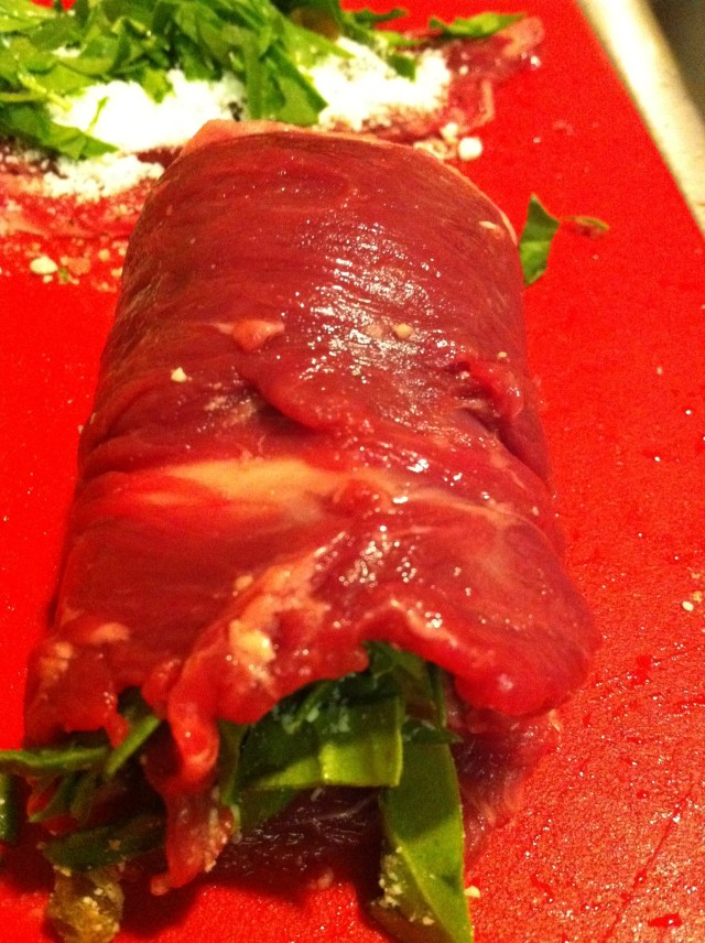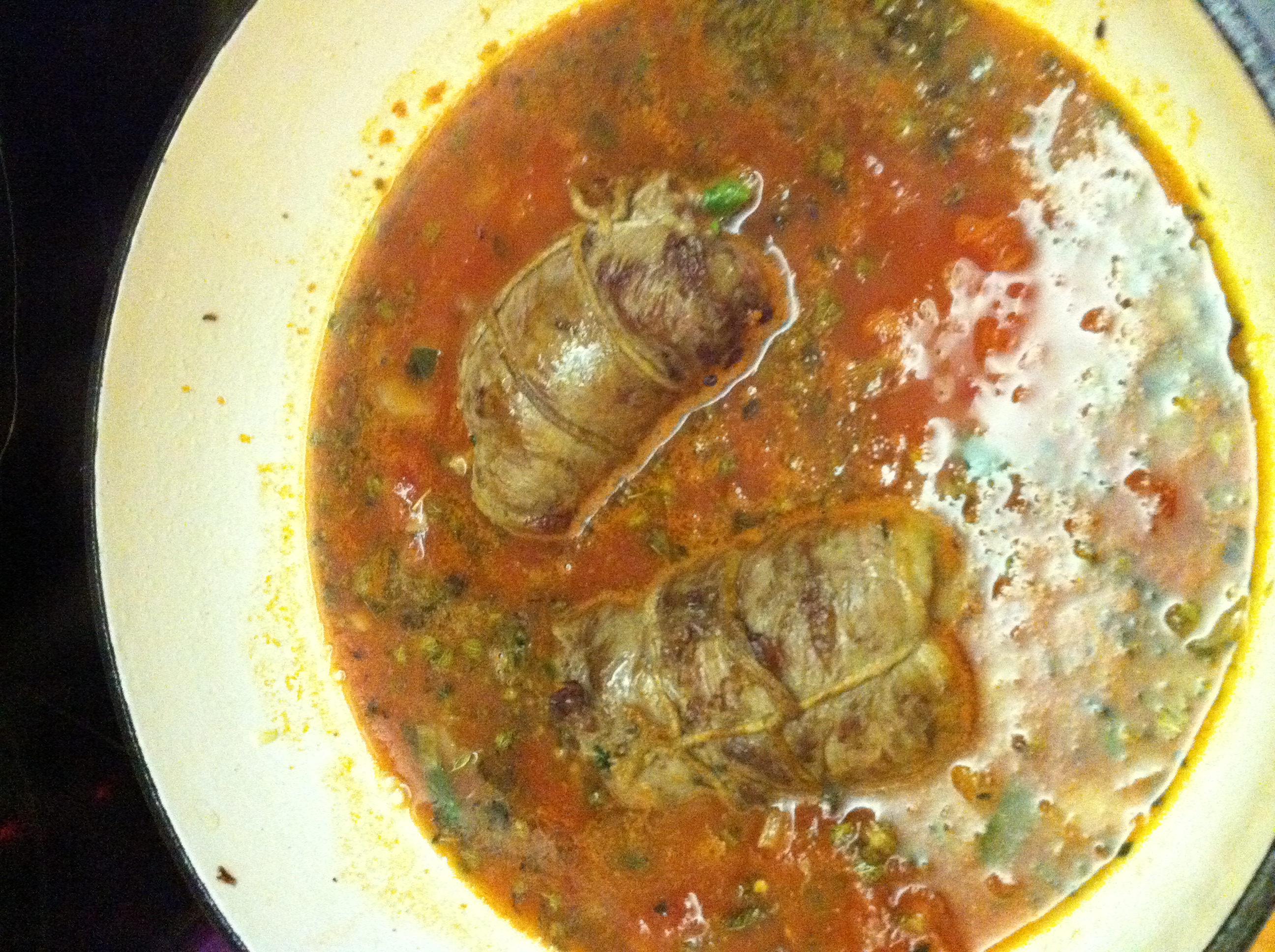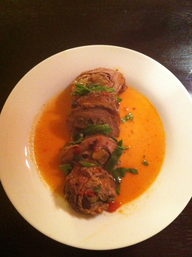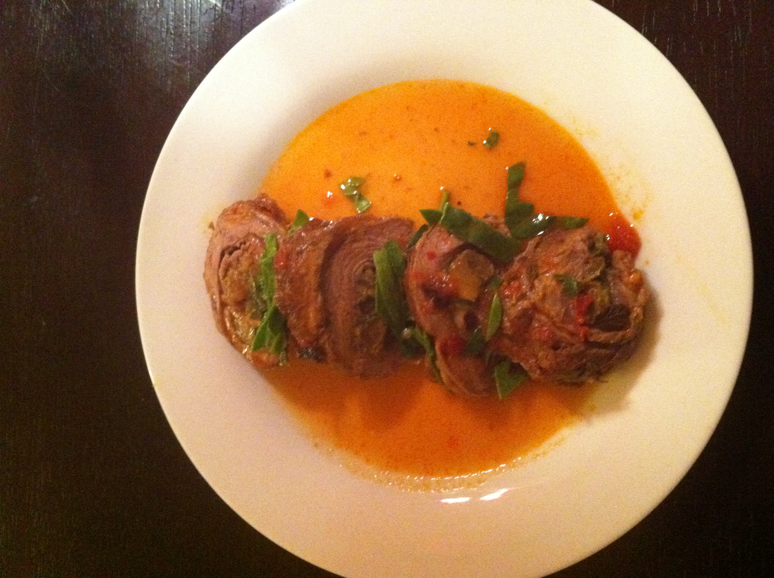 First, I pounded out the boneless pork leg parts. My meat came in 2 small parts, which were perfect for 2-3 people. Then, I stuffed them with chopped fresh spinach, grated pecorino, and golden raisins. I probably should’ve added some nuts to the stuffing for textural contrast but I forgot until the pork was all tied. Next time! Then, I rolled them up, tied them, seared them in olive oil on all sides, and then took them out of the pan. In the searing pan, I added chopped onions and garlic. Then, I added some way too strong oregano, and then deglazed with about 1 1/2 cups of sauvignon blanc. I reduced that a bit and added 1 small can of whole peeled organic tomatoes (the 14 oz. can, not the 22 oz. one). I brought that to a boil, added some red chili flakes and salt, and then put the pork bundles back in the braising liquid on low simmer. I simmered the small bundles for approximately 45 minutes, basting them every once in while. After that, I strained the liquid because the oregano was killing me it was so strong, then added in more tomato, a bit of sugar (my dirty little secret when canned tomatoes are too acidic) and reduced it a bit to make a nicer jus. I sliced the stuffed pork bundles; jus’d them up; chopped some more fresh spinach for the top; and had a lentil, feta, parsley and lemon salad as a side dish. Yum!
