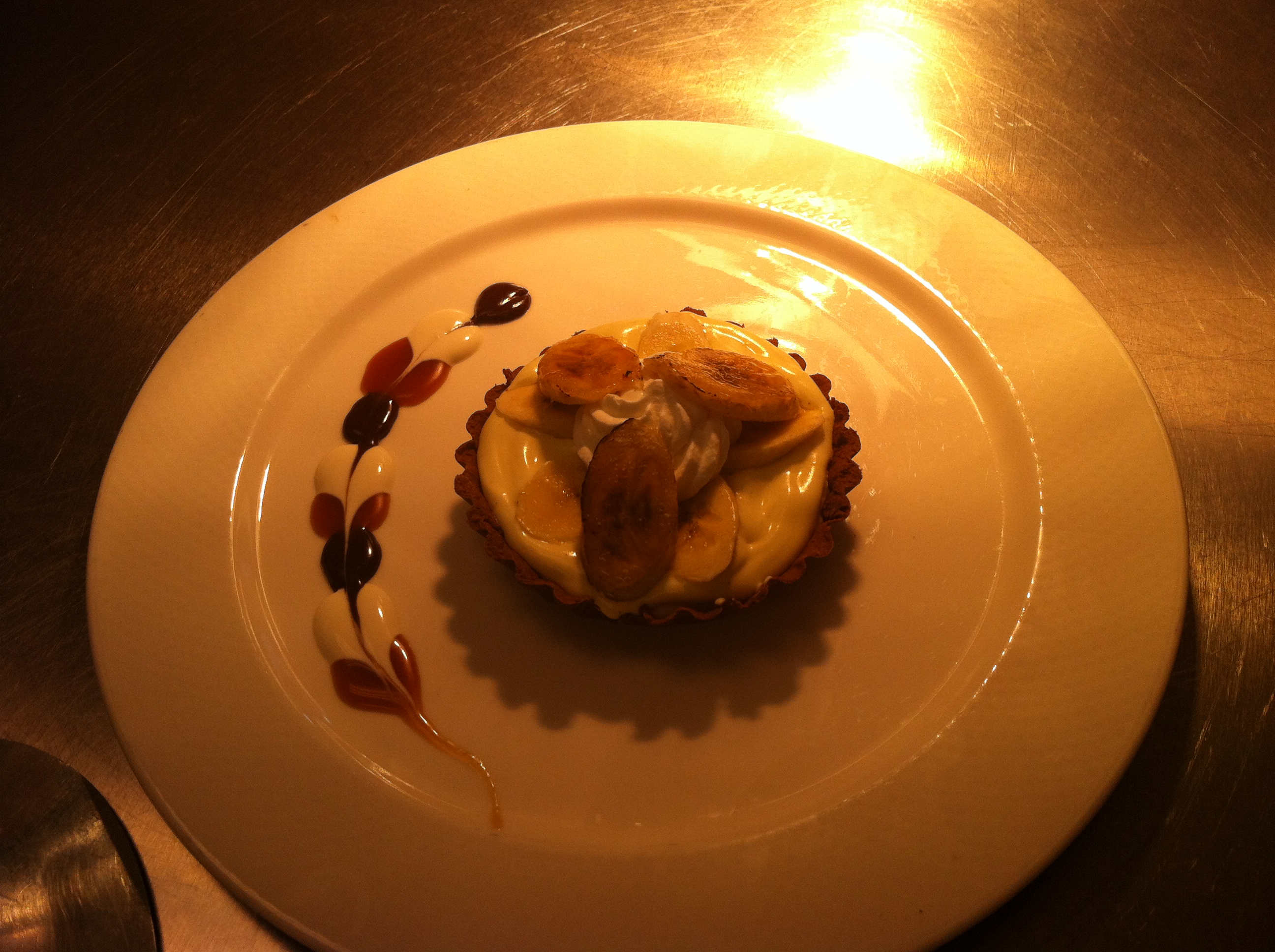 Okay, now onto happier thoughts. I made a really easy chocolate ganache that you can use for garnishing or as a sauce. Use a really good dark chocolate or bittersweet chocolate for this. The recipe is super simple: Bring 12 oz. of cream to a boil and pour it over 8 oz. of chocolate cut into chunks. Stir until all the chocolate is incorporated into the cream, so you have a semi-thick sauce. Cool it over an ice bath. If you need to thin it out, simply add in a little more cream (cold is totally fine), and stir. You can add vanilla to it, cayenne or any ground chili to it, or just about any other flavoring if you want to add another dimension to the ganache. We use the ganache to garnish the side of the plate for the banana-chocolate tart (see above). But, the sauce can be used over bananas, ice cream, tarts, etc.