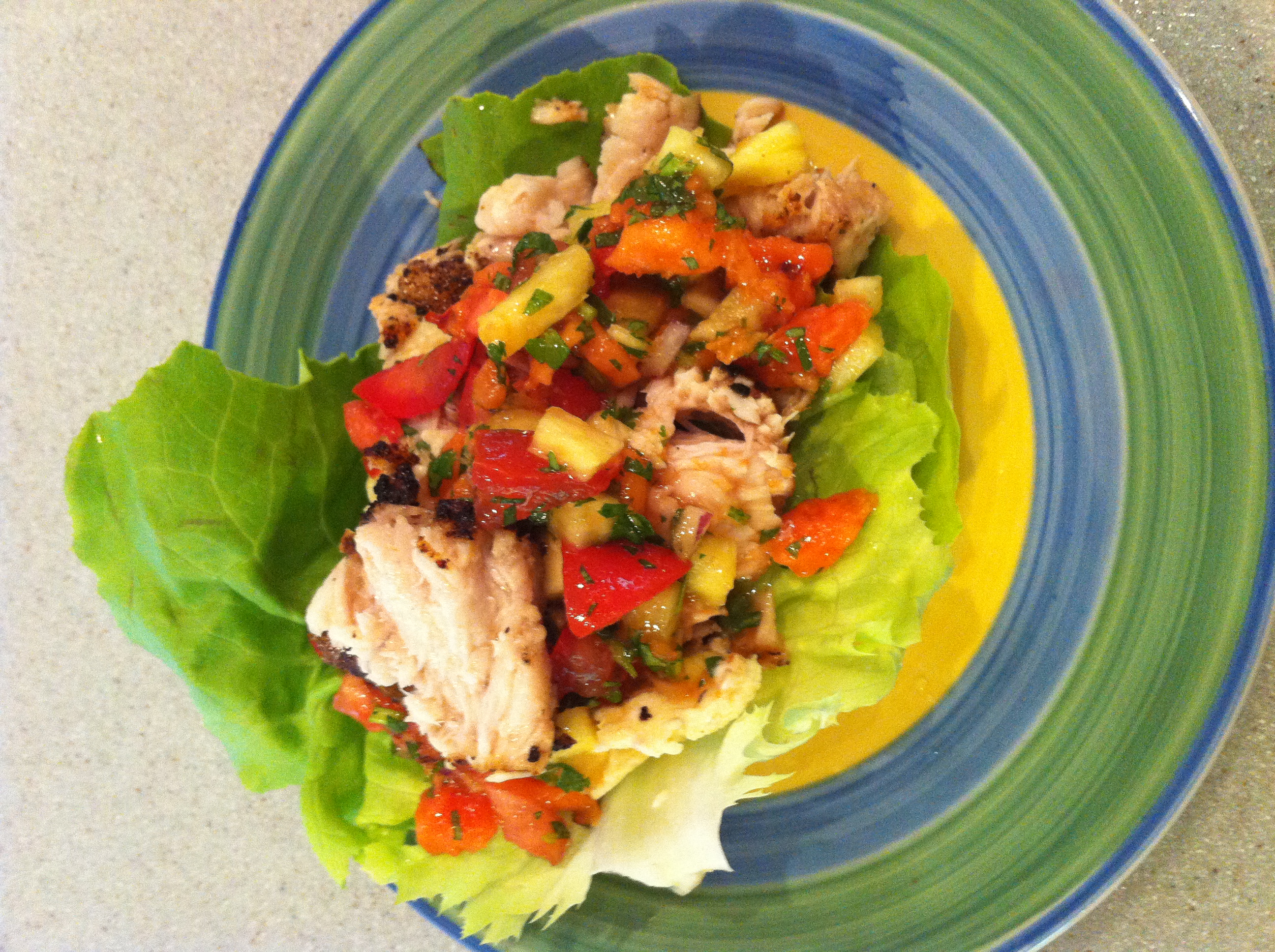Changing gears, one condiment I love is salsa. I think salsas are super versatile. They pep up any meal. For me, they can go on breakfast, lunch or dinner; they can be sweet or savory or both; they can be spicy or not. But, the best ones are fresh. When I was in Hawaii, we made a breakfast salsa to go with our egg, bacon and opah lettuce wrap. Here’s the super simple salsa, followed by the recipe: