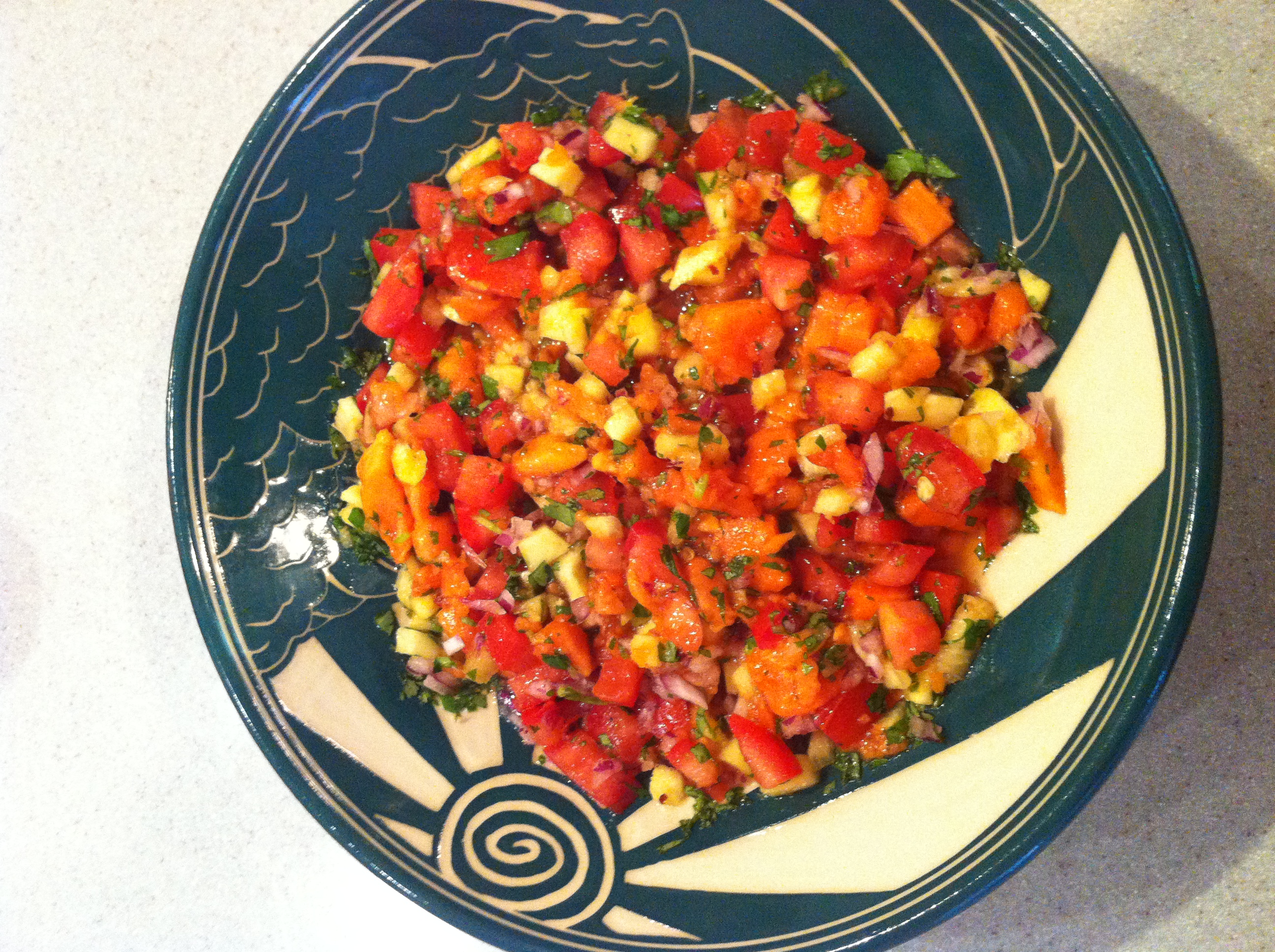 Directions: Mix altogether in a bowl and serve immediately. This salsa doesn’t really keep as it starts to break down, so make only as much as you’re going to eat in one sitting.
