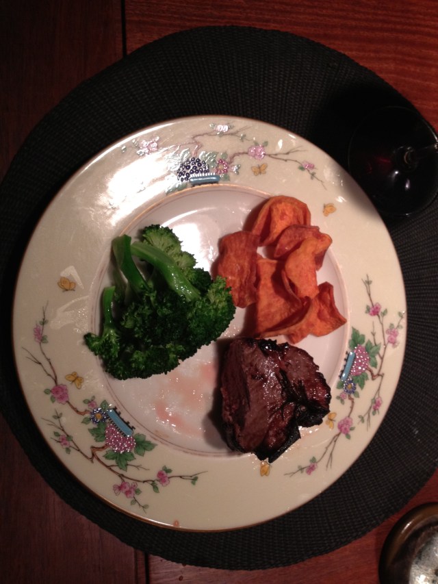 We indeed have Champagne with Gigi’s first course – a delicious mushroom soup. We also added in a glass of the Champagne to the mushroom soup at the last minute prior to service and it really made the soup pop. The rest of the meal, minus green tea mochi for dessert, is shown in the featured pic above. Gigi is famous for her lamb, and I love lamb. She marinated her chops in elderflower cordial. Sensational! I need to get a bottle of that. It had this beautiful, faint flower scent to it, and it married well with the one sprig of rosemary that did not overpower the elderflower. And, Gigi broiled it to a perfect rare-med rare.  Simple perfection.