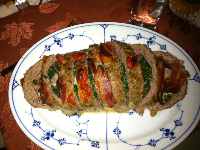 Janet’s meatloaf recipe starts with a standard lean ground beef and ground pork mix. She does 50-50 pork to beef, and last night it was 6 lbs of meat total. I should note that this recipe makes 2, 3 lb loaves, so it feeds a lot of people. To the meat she adds 2 diced and browned onions, 1/2 head of sauteed minced garlic, 1/2 cup of bread crumbs she makes herself, oregano, salt, pepper, and 4 eggs. For the stuffing, it’s 1/2 lb. of shredded mozzarella, thin slices of good deli ham, and lots of blanched spinach. She rolls the meat around the filling and shapes the loaves. On top, she puts 1/2 strips of thick cut bacon and cherry tomatoes cut in half. Then, she bakes the loaves at 350 degrees F for about an hour, and then broils the top to brown it at the finish.