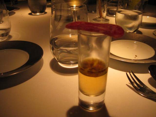 Course 1: a modern interpretation of the typical tomato bread – salami on top of a shot of tomato bread liquid
