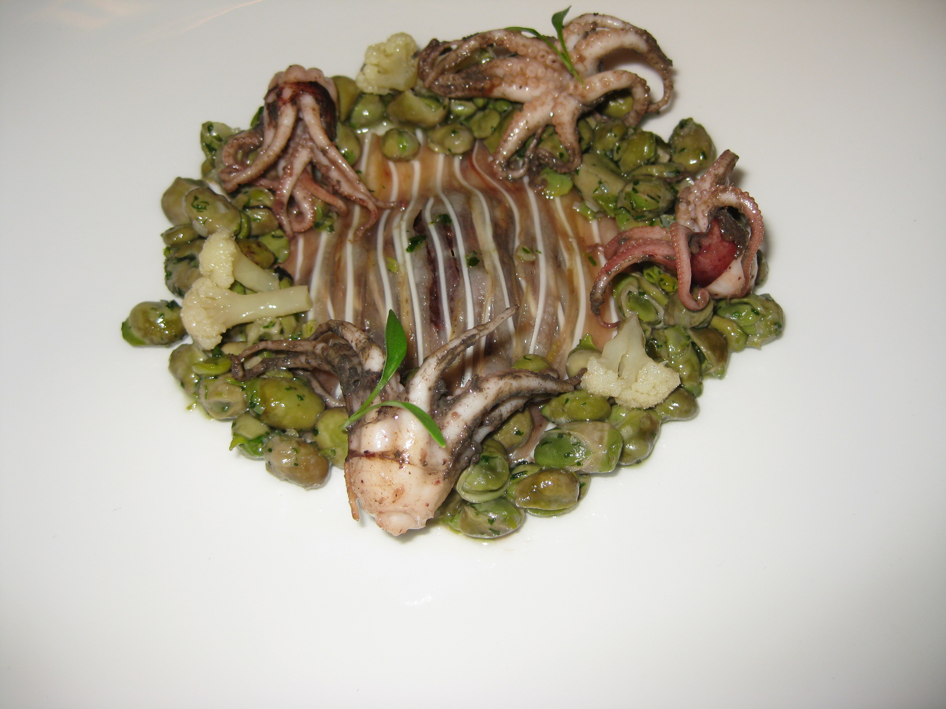 Course 7: blood sausage, pig ear strands, lima beans, octopus, and pickled cauliflower. This was my least favorite dish, mostly because it tasted dirty to me. Carnet said I blew it by not mixing it all together. Instead, I ate the cauliflower and octopus first because they were so delicious.