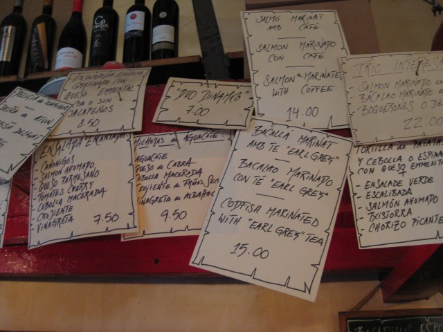 My favorite tapas bar is still El Bitxo (correct spelling in this blog post). Carnet and I went there for lunch on Day 7. He exclaimed “this is why I love Barcelona.” El Bitxo has 20 seats only, with 1 woman behind the bar who makes the tapas, serves the drinks, and puts on funky music to which she sings. Then, every hour, she has to take a smoke break. Loved it! Pics of the cute tapas bar are below: