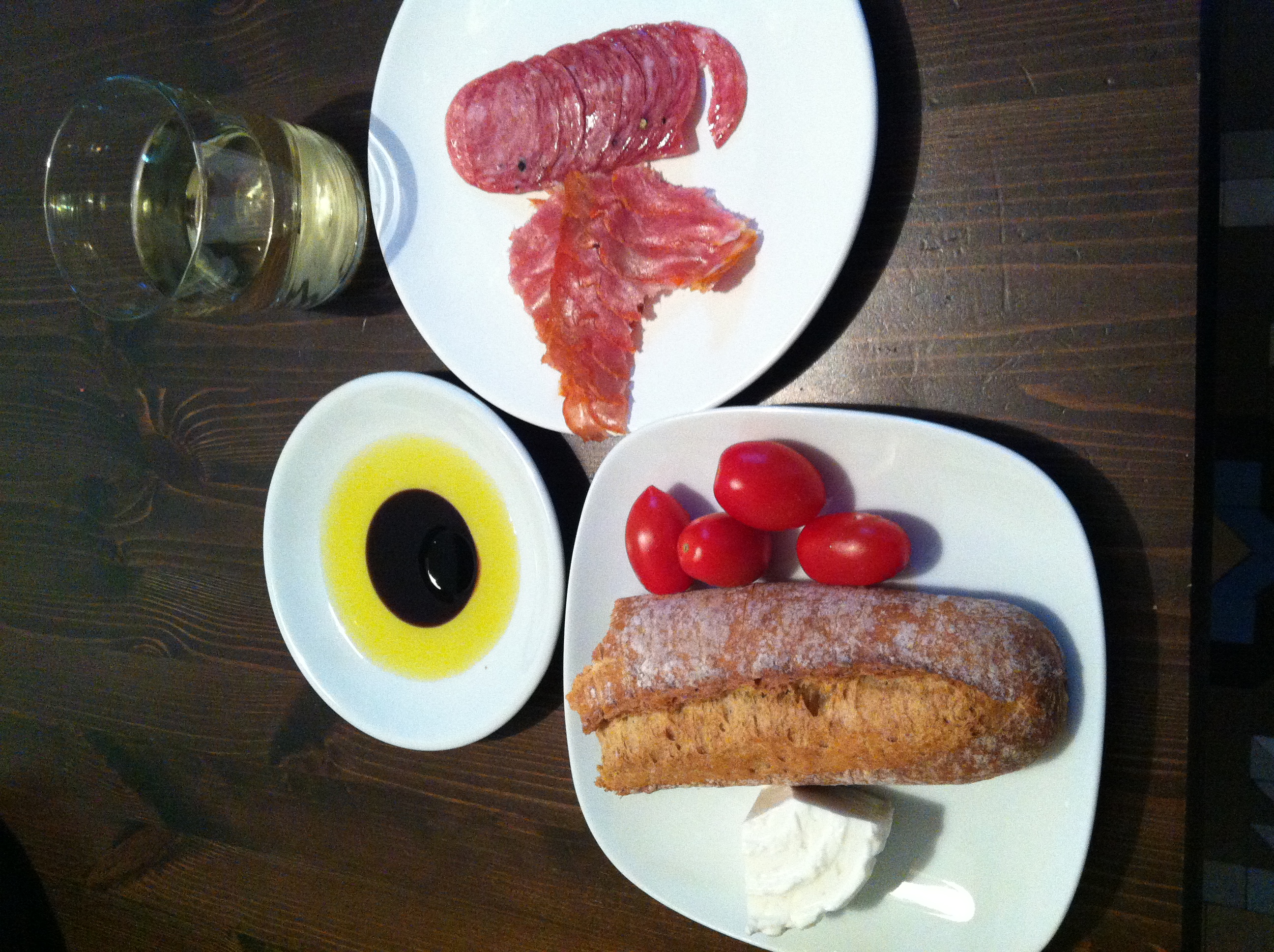 Queso fresco (fresh goat cheese), baguette, tomates, olive oil and balsamico, lomo embuchado (cured pork loin), salchichon (salami), and vino blanco: