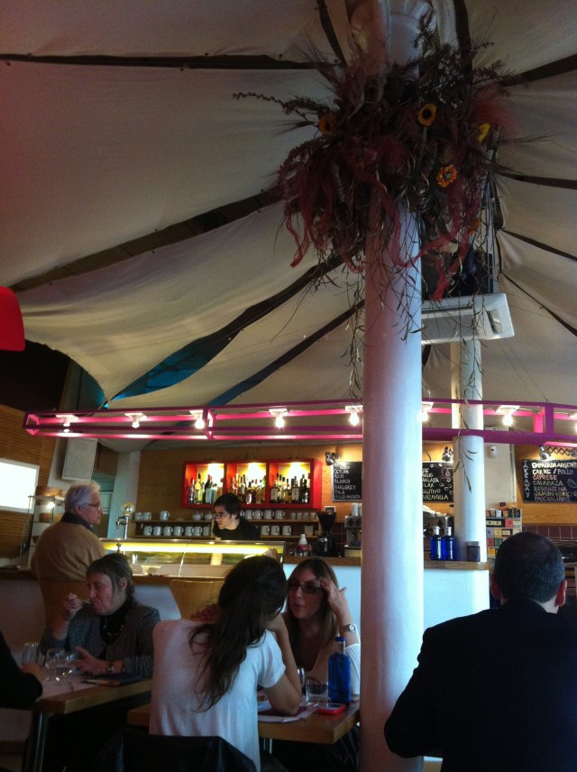 So…I went to the following site: http://www.sincarne.net. (sin carne = no meat, or without meat). I found a place close to my apartment called Habaluc. It is purportedly an “organic” restaurant with veggie options. It has pretty good decor, especially the ceiling. They did a great job with softening what could have been a very loud place due to the ceilings underneath the fun, cloth “tent” they attached to the ceiling. The service was great, so I thought this was all very promising…. until the food came. Bad ingredients, poorly executed. Disappointed. Why use organic tomatoes when they are out of season, look anemic and taste like cardboard? It was so unnecessary, especially when the salad already had sun dried tomatoes, which is the obvious choice when the fresh tomatoes suck. My second course, which I thought was going to be a terrine of shrimp and vegetables, turned out to be overcooked pasta in a light cream curry sauce topped with 1 undercooked shrimp. Really? The menu said terrina de gambas. When there is an “s” on something, I am expecting more than 1. I was so bummed I couldn’t even eat dessert. This, in retrospect, could have been the thing that saved it. As I paid and was walking out, I spied someone with the cheese and anise postre. It did look delicious. Okay, maybe I’ll stop by again but just for dessert.