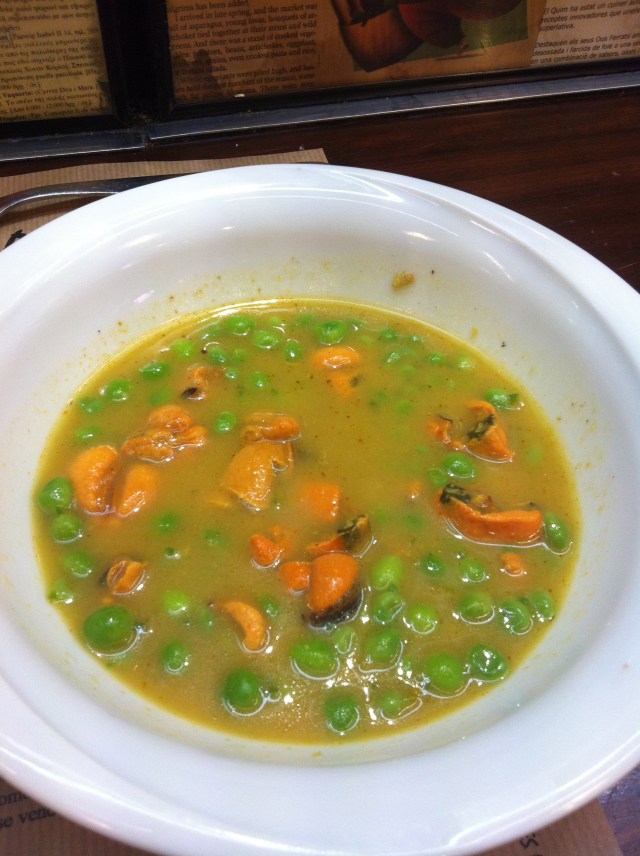 12) put broth back into a pan and simmer for a few minutes. add reserved muscles and fresh peas (frozen will do if that’s all you can get) and cook for 1-2 minutes more, if using fresh peas. if using frozen peas, take off heat almost immediately, so peas still have a bit of crunch to them. serve hot with baguette.