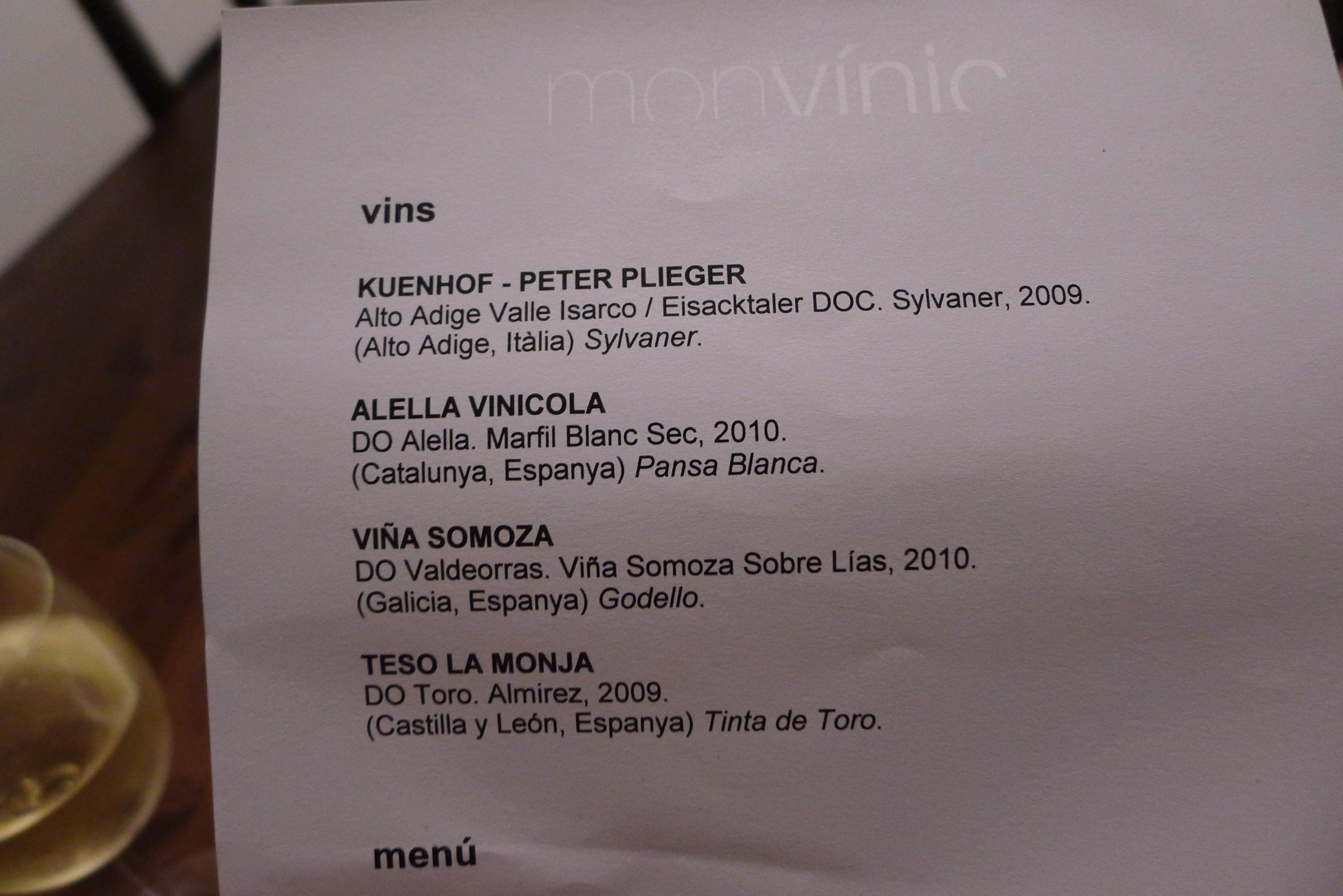 After a quick 1 hour throwing my feet up again on the couch, I journeyed back out to meet Sara, the Sommelier of Dos Palillos. She invited me to do some wine tasting at a wine bar near my place called Monvinic (see the menu of the wines we sampled in the picture just above this paragraph). This wine bar is a very cool concept. It’s staffed by all sommeliers, they change their wines EVERY WEEK and they have a boat load of them, they have a wine library that anyone can use inside the restaurant, and the menu is similar to an ipad on which you scroll through and select your wines, see pictures and prices, etc. We tasted 3 half glasses each of different whites and 1 half glass of a tempranillo. Sara explained the demoninaciones to me and we talked a lot about wine. We were joined halfway through by her friend Kaitlin who is a nurse and works in an ambulance. Then, about an hour before we left, Sara’s boyfriend joined us. He used to be a chef who worked in England, but now he’s a photographer and activist.
