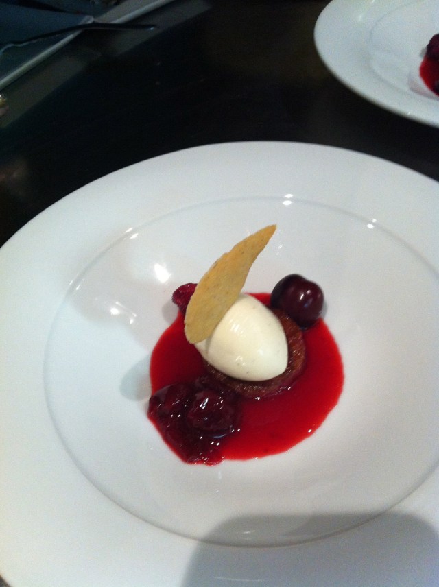 The finale at lunch is the cherry and vanilla dessert. It’s a sour cherry puree with liquor on the bottom, then a small spoonful of sour cherry marmalade, one fresh cherry, and one dried sour cherry triangulated around a cross section of bizcocho (cake) soaked in a cherry juice reduction, topped with vanilla ice cream and a vanilla “wafer”. Beautiful. The sour cherries are expertly complimented by the sweet ice cream. Here is the dessert: