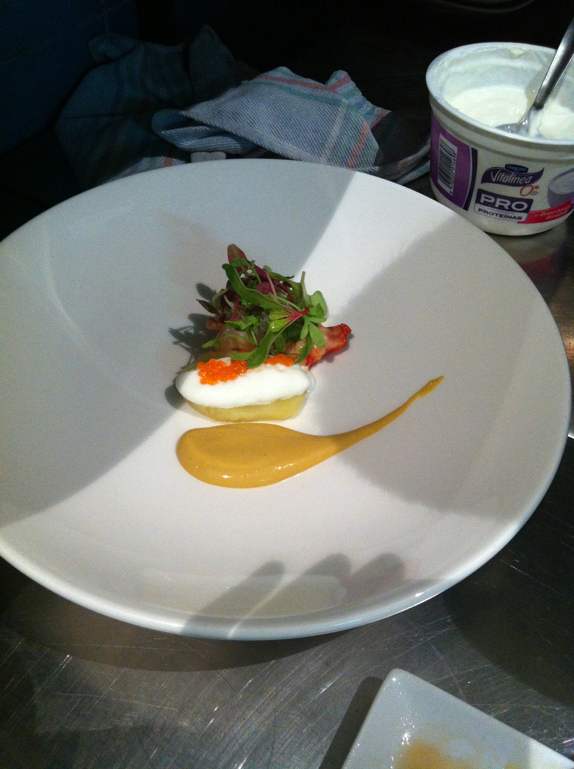 So far, amazing and good! I like my chef Frederic a lot, except that he has threatened to put “cinco kilos” on me before I leave at the end of the month. Translation: he thinks I’m skinny and wants to put 10 pounds on me by the end of June. No problem. I’ve already eaten his sweetbreads and artichokes with truffle sauce, tasted some of their cheeses from their cheese plate, and tasted the sour cherry and vanilla dessert – all delightful. Yep, I even liked the sweetbreads, but of course that was because they were fried and smothered in a delicious sauce on top of a fried artichoke.