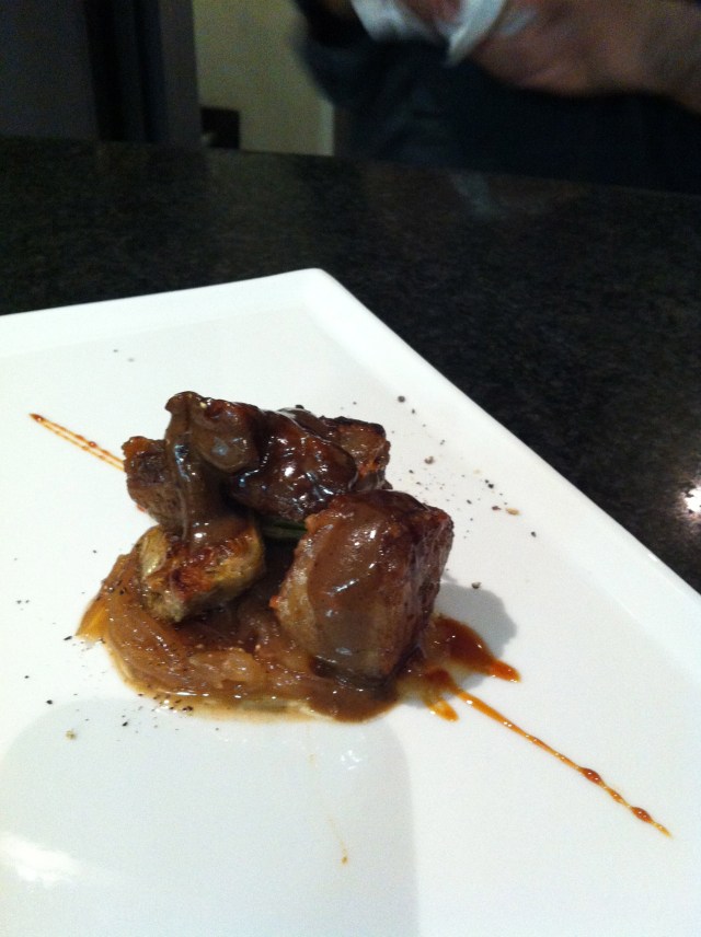 Fourth course: a mini terrine of caramelized onions, topped with fried artichoke hearts, topped with fried sweetbreads, topped with a truffle, cilantro sauce, and finally topped with a drizzle of miel de caña. Miel = honey. Caña is beer, so I’m missing something in translation on what type of honey it is in actuality. I’ll get clarification on that later. Here it is: