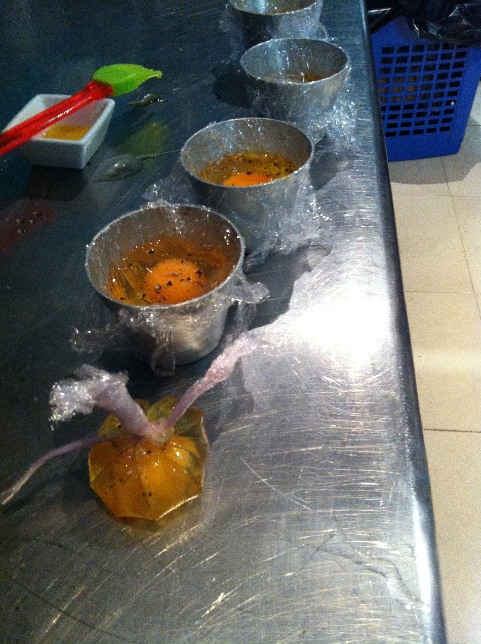 One last parting thought before I stop blogging for a few days (I’m going up to Cadaques to meet Shan, Fred and their kids)… I think good chefs don’t mind sharing their recipes. This question of to share or not to share isn’t new, and many great chefs whom I have had the pleasure to meet or hear speak have said they have no problems sharing their recipes. Why? Because it’s about endless reinvention. You share and someone “plays” off of it and makes it different or maybe even better. The idea of putting eggs in film is not new, but it was new to me and I love the idea because of the way the egg looks and for the ease of cooking. The idea of putting foie with apples isn’t new, but the Osmosis twist makes it excellent. Would I change something about each recipe? I might, and maybe I will if I use either. It’s about sharing ideas to keep pushing the envelope. And, people go out to dinner because they don’t want to make the food at home, even if they have the recipe. So, I will always share my recipes (and those of others whose I have, unless I’m specifically forbidden not to, of course). Please, try them, experiment with them, have fun with them. That’s what making food and cooking is all about!