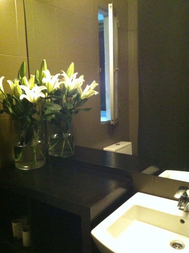 I have always said the mark of a good restaurant is the bathroom. That may sound silly, but I think you need to look at how the owner/chef treats every aspect of the restaurant. If it’s gross and dirty and the bathroom is disgusting, your food is probably not handled quite as nicely and is not as “clean” as it should be. So, this is the employee bathroom at work. Yep, fresh flowers, cloth hand towels, very clean. It has a shower, which the cooks use in between shifts as it’s bloody hot in the kitchen and it’s not even mid-June.