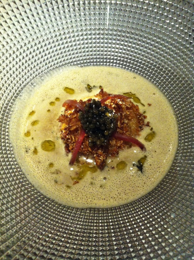 For 84 Euros per menu degustacion, I expect my socks to be knocked off, not just by one or two plates, but by all 8. Unfortunately, this wasn’t the case at Sauc restaurant last night. My favorite dish was the poached egg, topped with cereal and caviar all set in a cappuccino broth. It may sound a little strange but it looked awesome and it tasted even more awesome than it looked. The picture is at top. I loved, loved, loved it!
