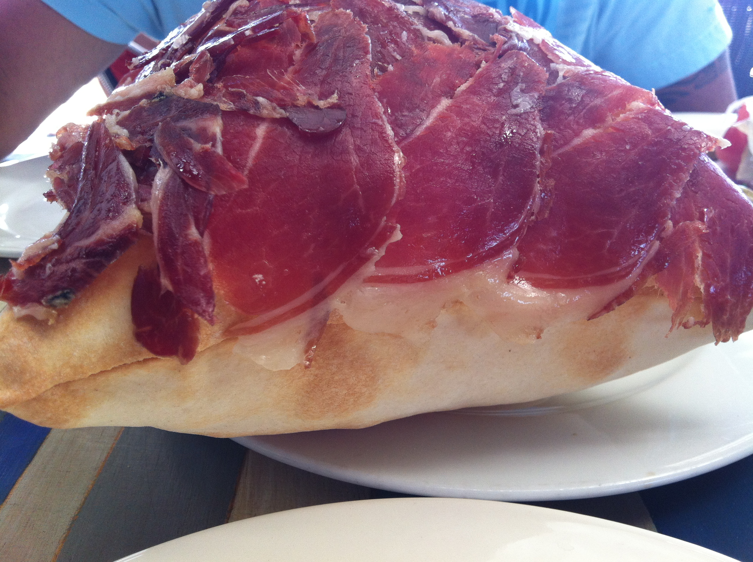 Sunday, I went to the beach with Quim and to Escriba, a seafood restaurant on the beach. There are 2 Escriba brothers who are friends of Quim. One of the brothers is a chocolatier and the other is a chef/owner of the Escriba seafood restaurant. At the restaurant, we had delicious paella Valenciana, a yummy tomato and onion salad, great clams, and my favorite dish – this puffy, hollow flat bread with jamon iberico on top, served with a side of tomato fondue. The presentation was fun! Here’s an iPhone pic: