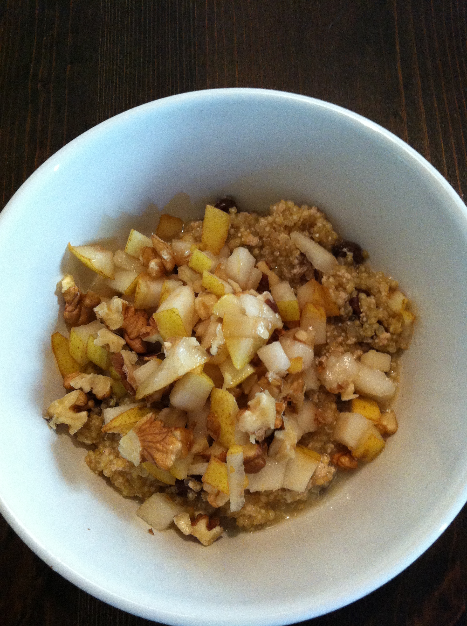 So, after such an indulging weekend, it’s not a surprise I had a horrendous stomach ache all Sunday night and Monday. After work on Monday, I went to the health food store and bought some aloe vera designed to drink (it coats the stomach and aids in digestion) and decided to eat healthy for a few days. Dinner was a bowl of miso soup with shitakes and tofu (I made at the apartment). Breakfast this a.m. was a bowl of quinoa cooked in milk, honey and cinnamon, topped with raisins, walnuts and fresh pear. Here’s breakfast: