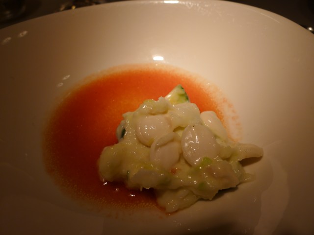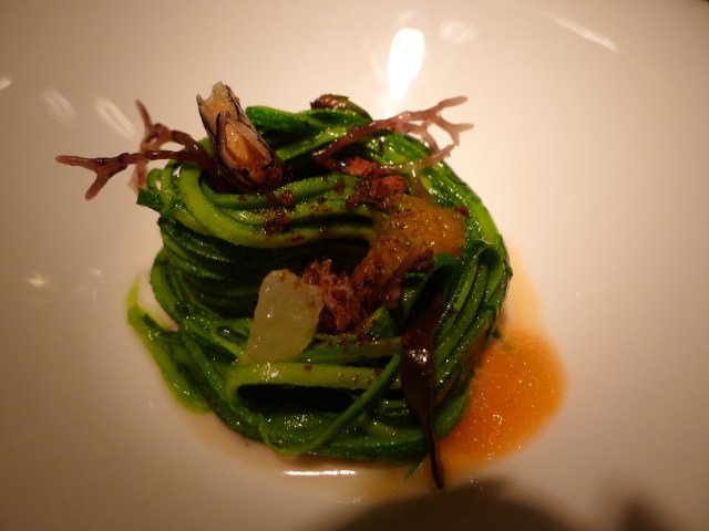 First course: Zuchinni spagetini with barnacles, algae, lemon supremes, razor clams, the smallest caviar i’ve ever seen, all in a very punchy, citrus dressing – yummmm! This was a perfect starter.