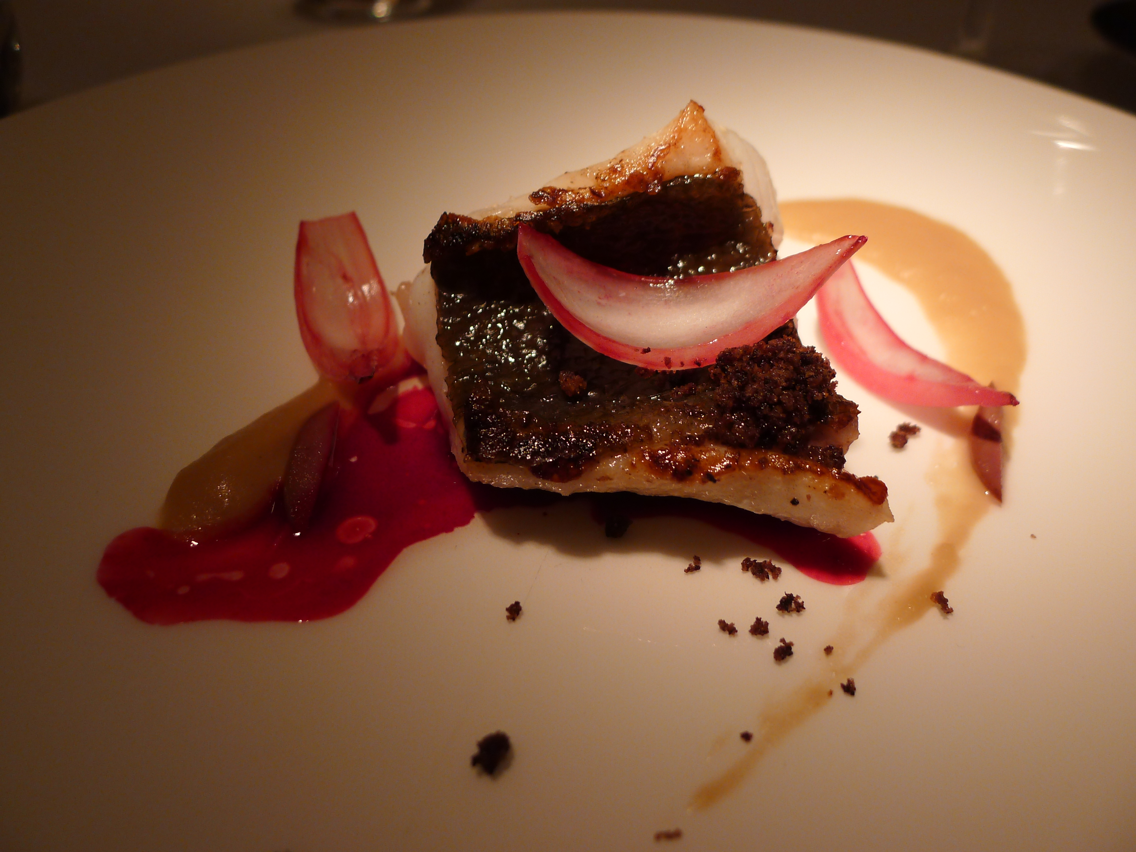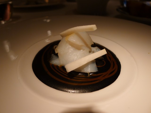 Fourth course: Cuttlefish with ink and pickled ginger. This was my favorite presentation because I think it’s very moody and modern. But, overall the dish was a bit too fishy for me. I think I’m just not a fan of cuttlefish, as dad and Maren really liked it. The sauce was delicious, however.