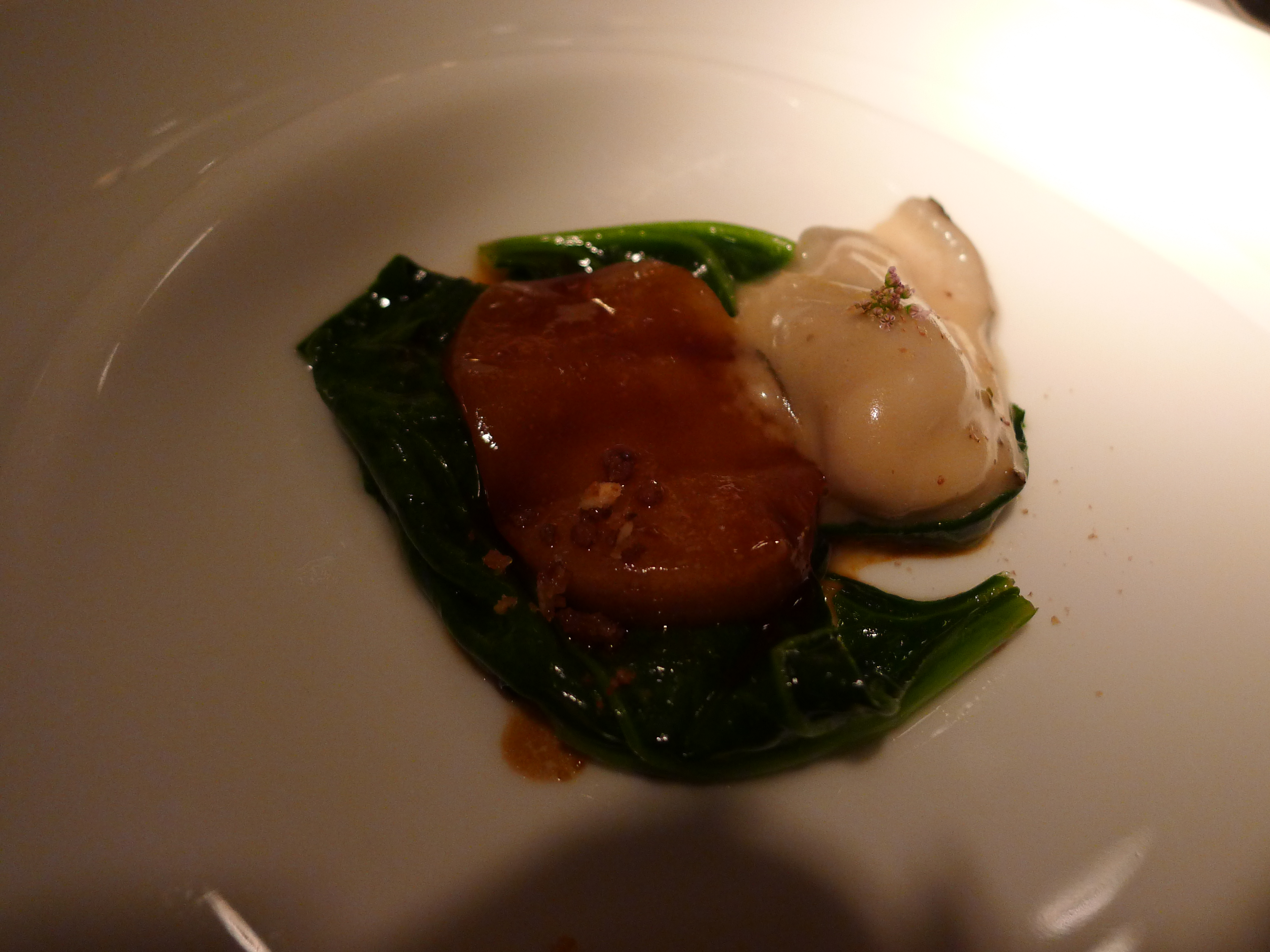 Third course: Pickled oyster with pork cheek over spinach. I loved, loved this dish. The star was the pork cheek. You didn’t even need a fork, let alone a knife to cut it, it was so tender. The spinach was perfectly cooked and the pickled oyster was a great pairing with the rich pork cheek.