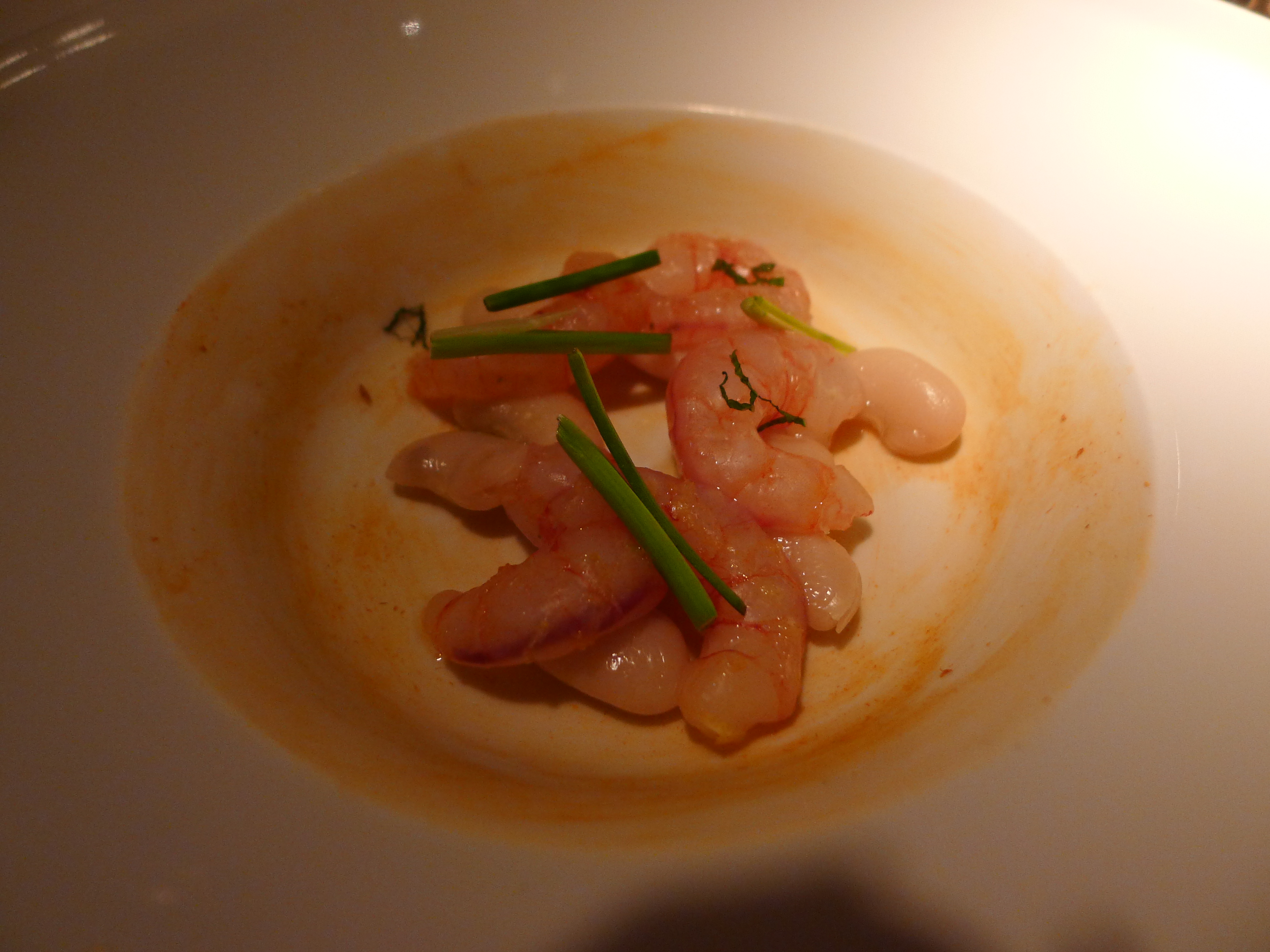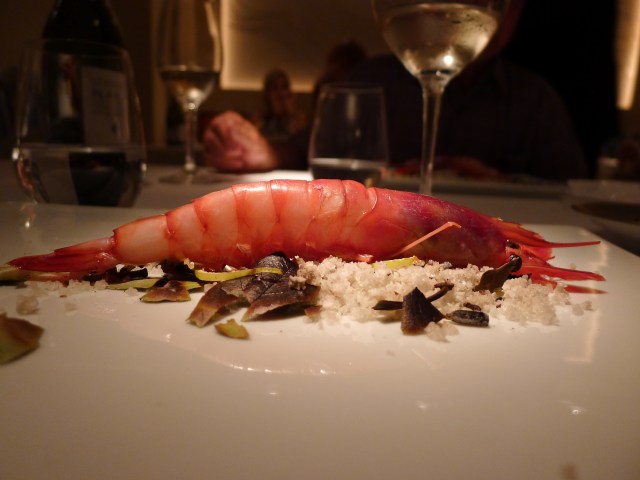 Fifth course: Smoked gambas (large, red shrimp from the Med Sea) with cocoa nibs over hot rock salt containing charred bay leaves, crushed cloves and sliced lemon rinds. They smoked the shrimp over these and the plate and the salt came hot, so it was a gorgeous aromatic presentation. The gambas were still a bit crudo and you could really taste the clove and lemon on them. In my opinion, this was a perfect dish.