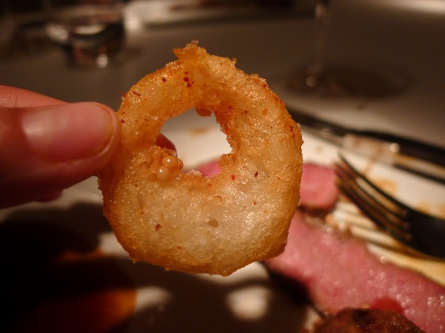 Eighth course: Beef and crispy gizzards with pickles, tempura onion rings, tangy mustard seeds, and some crudo vegetables. This was my other favorite dish of the night. Again, everything was perfectly executed. The beef was ridiculously good, the tempura onion rings were crunchy and light, and the whole seed mustard sauce over the baby crudo veggies was the citrusy element it needed for balance alongside a rich beef sauce.