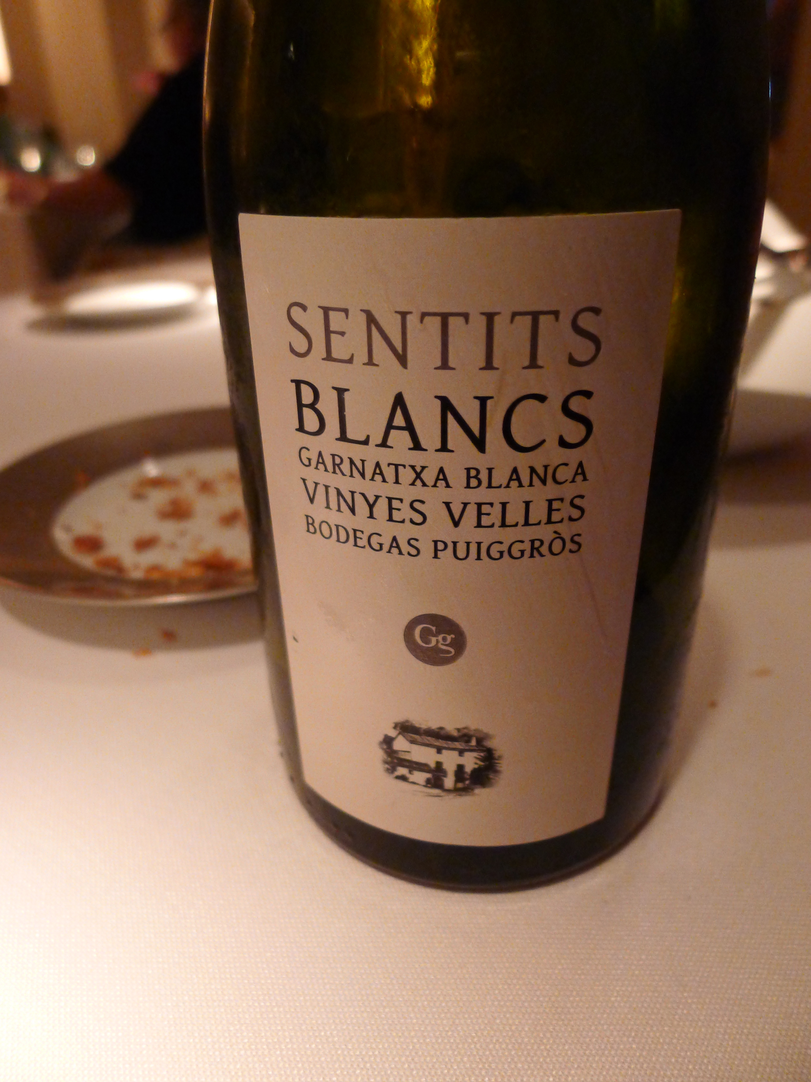 Onto drinks… we started out with our requisite “copas de cava”, and they were lovely, big pours. Next, we ordered a bottle of white to go along with our mostly fish meal. It was so different and delicious. I will definitely order it again, as it was fairly dry, mineral-y, pretty complex for a young white, and it was not expensive. Here’s the pic: