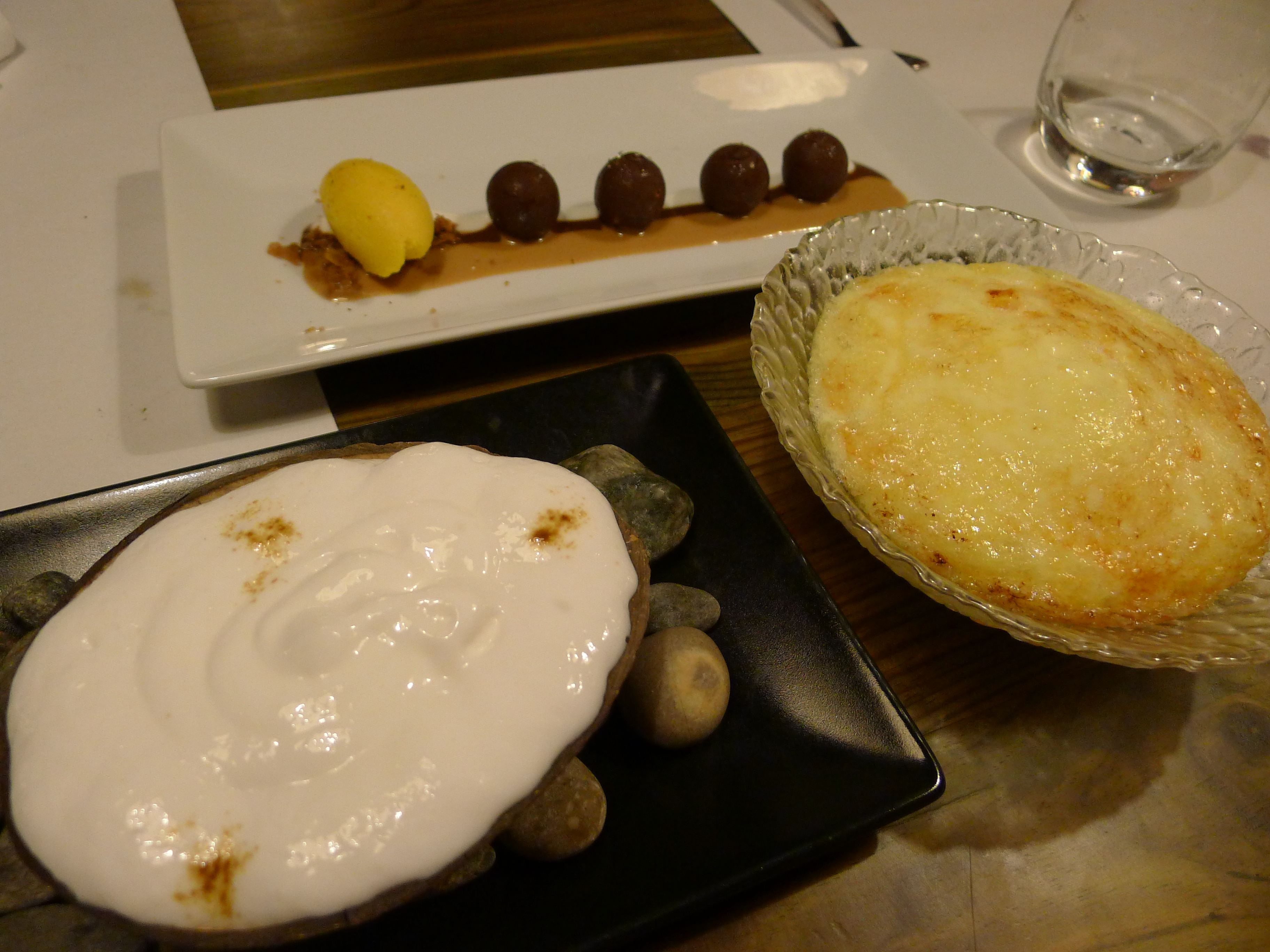 3) The desserts: I had the “pina colada”, Diana had the espuma (foam) of crema catalana, and Maren had the tasting of white chocolates (they were hidden in milk chocolate ball coverings):