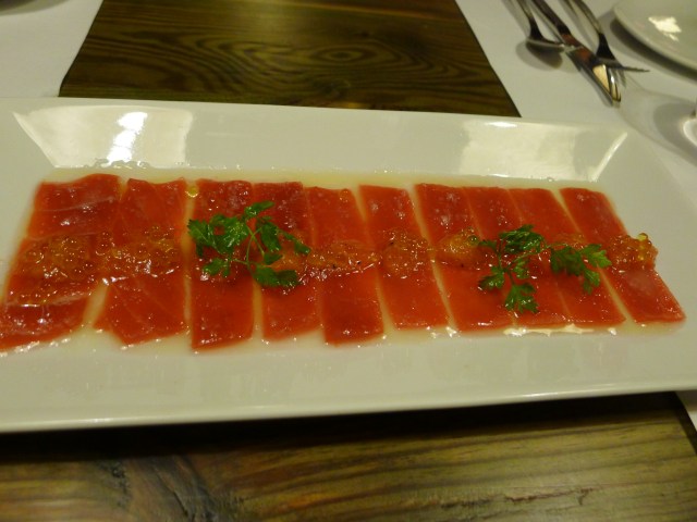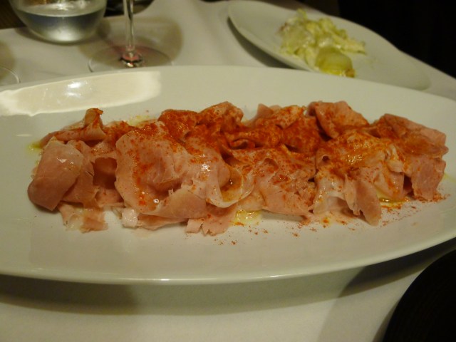 3) The tuna tartare. Although I am so very used to many different raw tuna preparations, the use of olive oil and citrus in this made it a perfect tartare. Thanks to my friend, Diana, as she’s the one who got us this “off menu” dish. She heard our first very bad waitress offer it to another table and so she asked the sommelier why we weren’t offered it. He said the people next to us were special friends of the chef, but then Diana said I was a chef, so he told us he’d bring us a plate. I love that she pulled that card out! It was kind of embarrassing, but Diana, C and Shannon have no hesitation throwing that out there, and it does get us better service and often-times some things not on the menu 🙂 I can’t quite do it, as I don’t think of myself as a chef yet. I know I’m a good cook, but until I open a business of my own, I don’t consider myself a chef. Anyway, here’s the beautiful tuna: