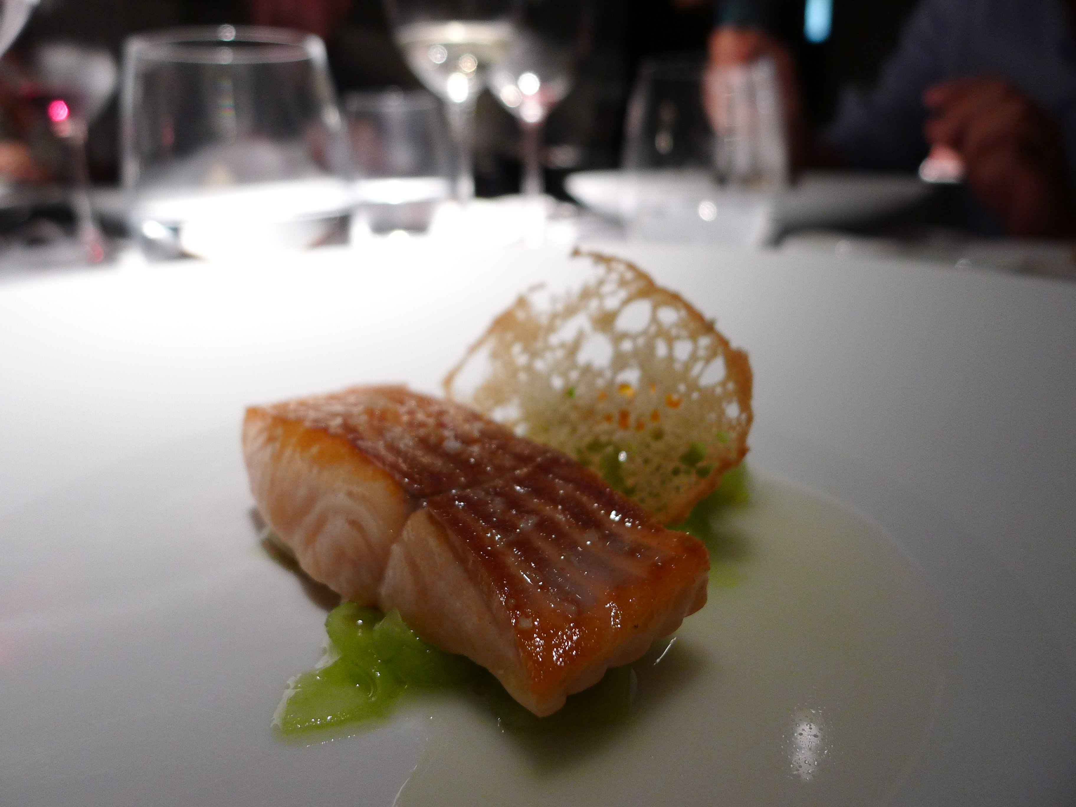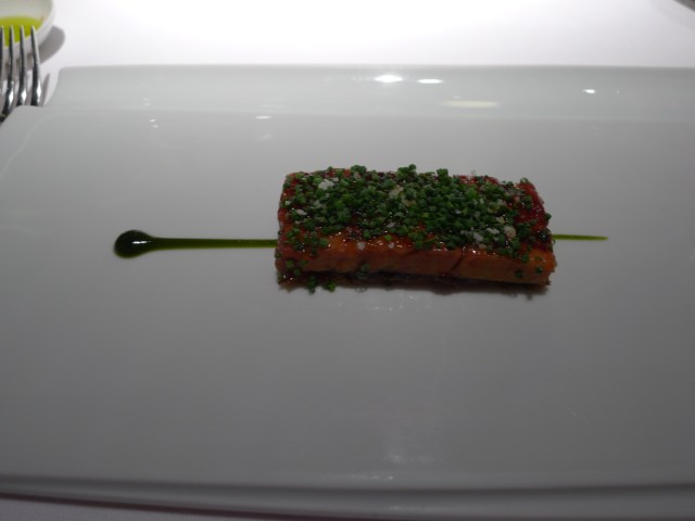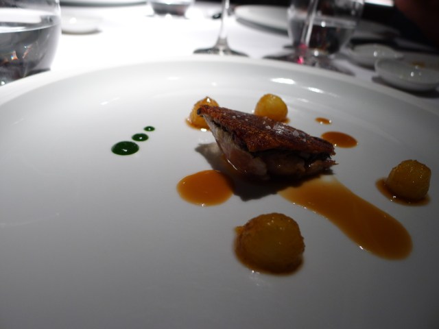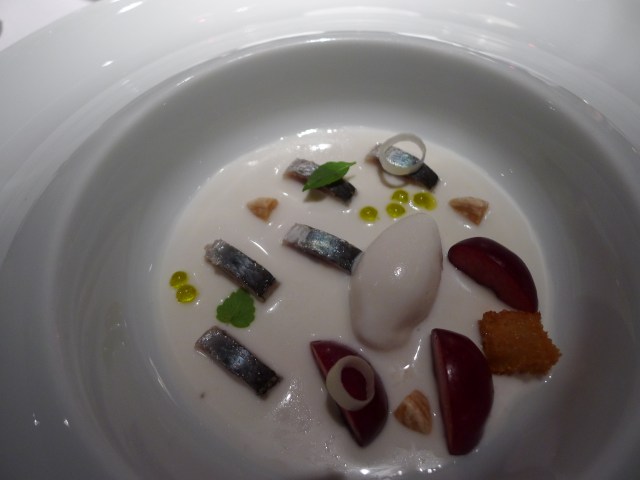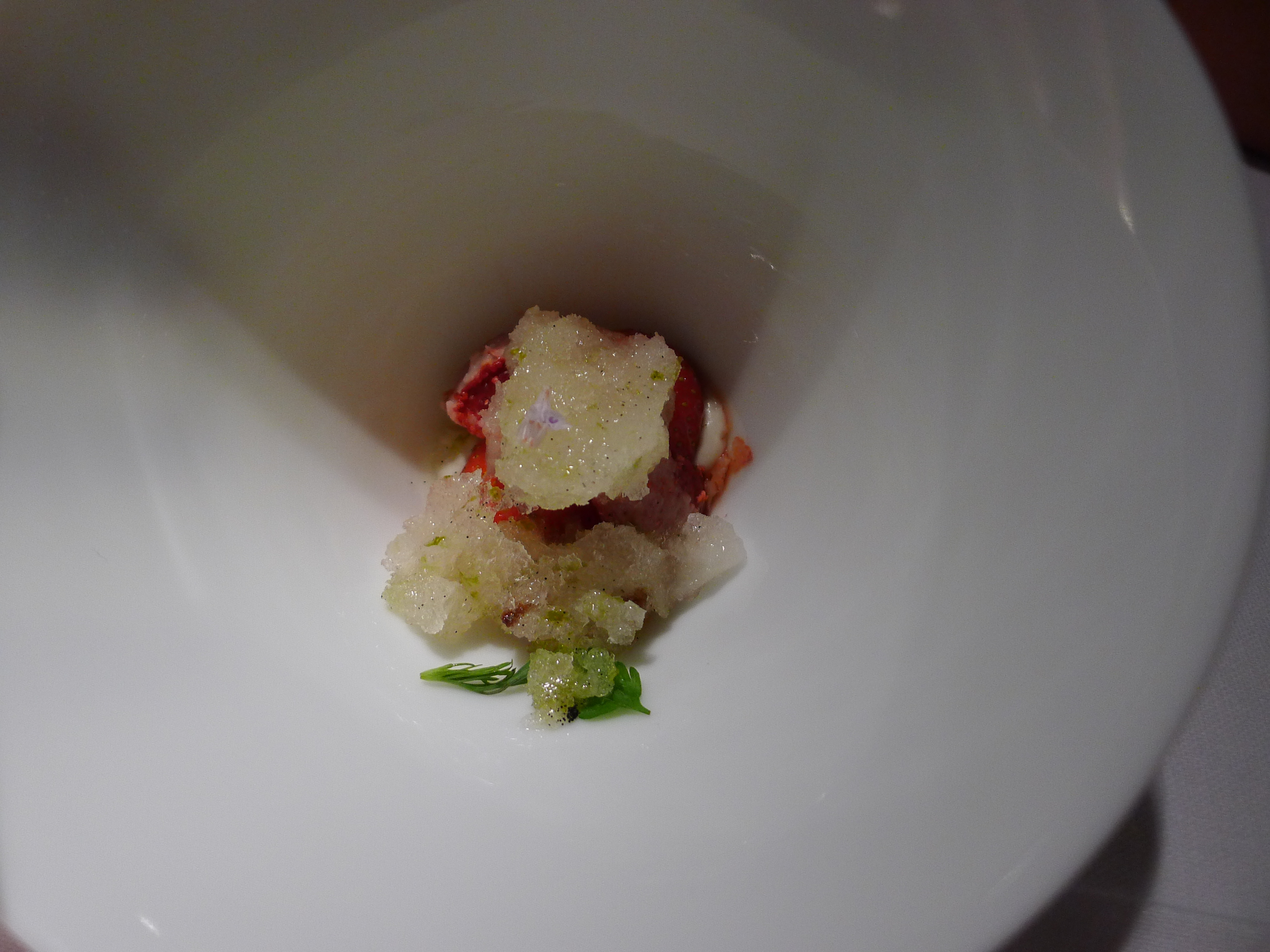 The second starter was a dish C loved. It was a cold soup of sorts. The components were just beautiful. It was pickled mackerel, olive oil balls (spherification), herbs, fresh plums, a crouton and sorbet.  All of the components eaten together were marvelous. By itself, the fish was way too briny for me.  I have a conflict. I think each item should be “perfect” on its own and then when combined, divine.  But, I suppose if something is meant to be eaten as a whole, I shouldn’t discredit it for one part not being perfect on its own. I’ll have to contemplate that more when doing my own menus.