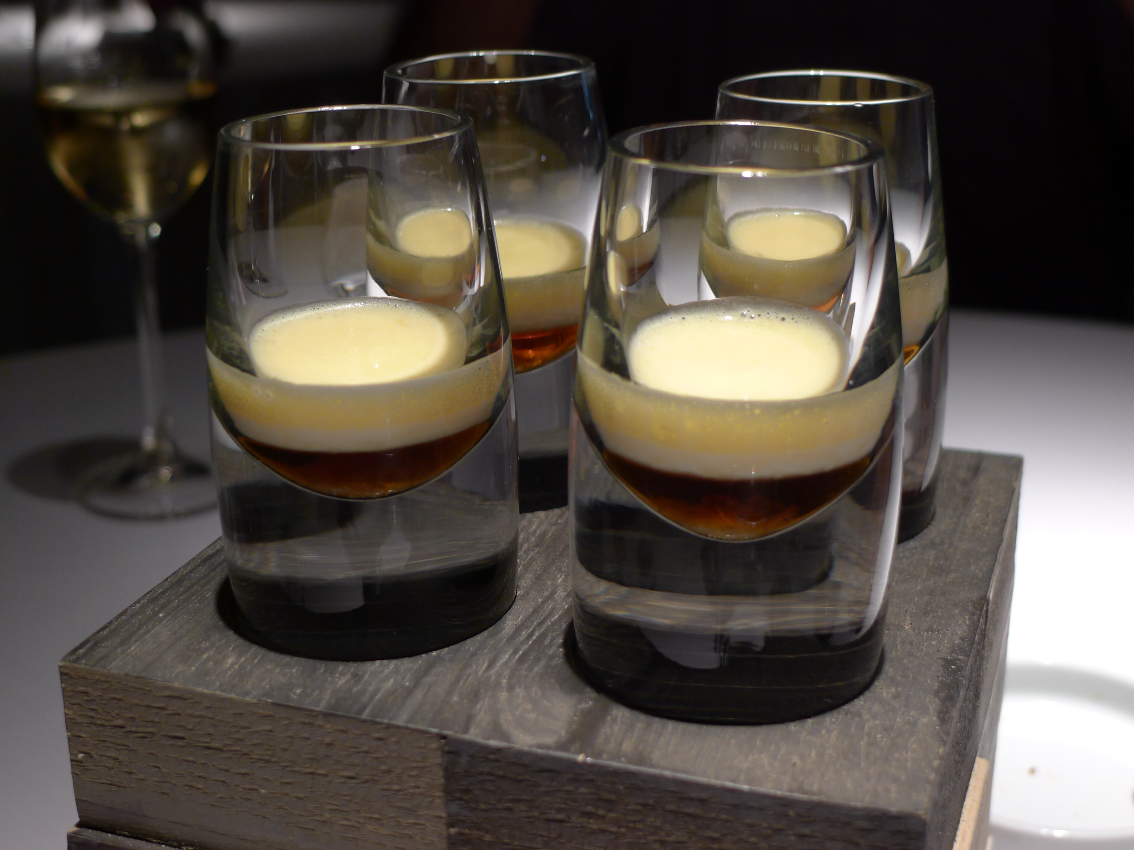 Before the first course – the tapa – we were served an “opener”. This is what hooked me. It was a “shooter” of sorts, with 4 layers: 1) maldon sea salt on the bottom, 2) Canadian maple syrup next, 3) whipped cream in the middle, and 4) a cava sabayon on top. Wow! That was delicious. Perfect sweet, salty, creamy to get the palette going.