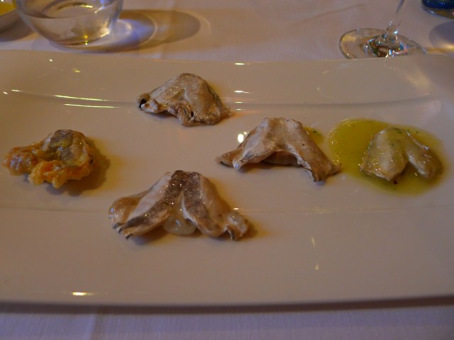 Then, we hopped in the car and drove to a small town called Getaria for lunch. We dined at a restaurant called Elkano, which has 1 Michelin star. See http://www.restauranteelkano.com for pictures of the restaurant and some food. But, I’ll go through our lunch menu, below.